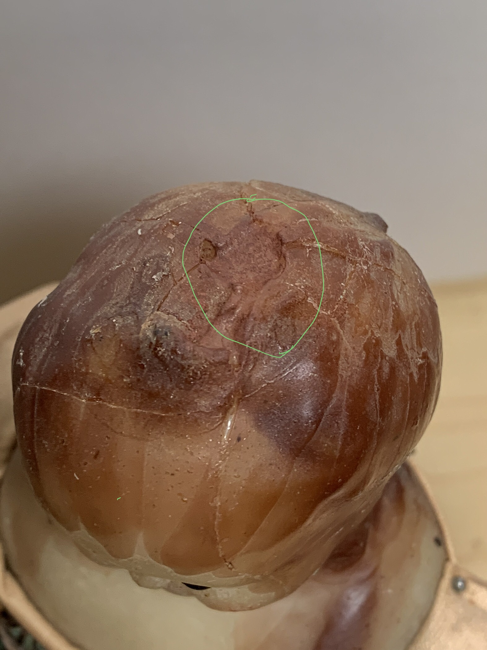 I set out to find the pieces that had her hair.  The hair was applied with a technique called wax encaustic, where colored wax is applied while hot.  The wax was painted on to simulate brown hair, laying softly on her shoulders.  Her eyes are hollow black glass beads pressed into the wax and survived unscathed.  Her solid wax arms were fine except she had a clean break to one tiny thumb.  I felt I had managed to get most of the bigger pieces – there were lots and small and tiny pieces of wax, broken leaves and the remains of the old glue which look like chunks of amber.