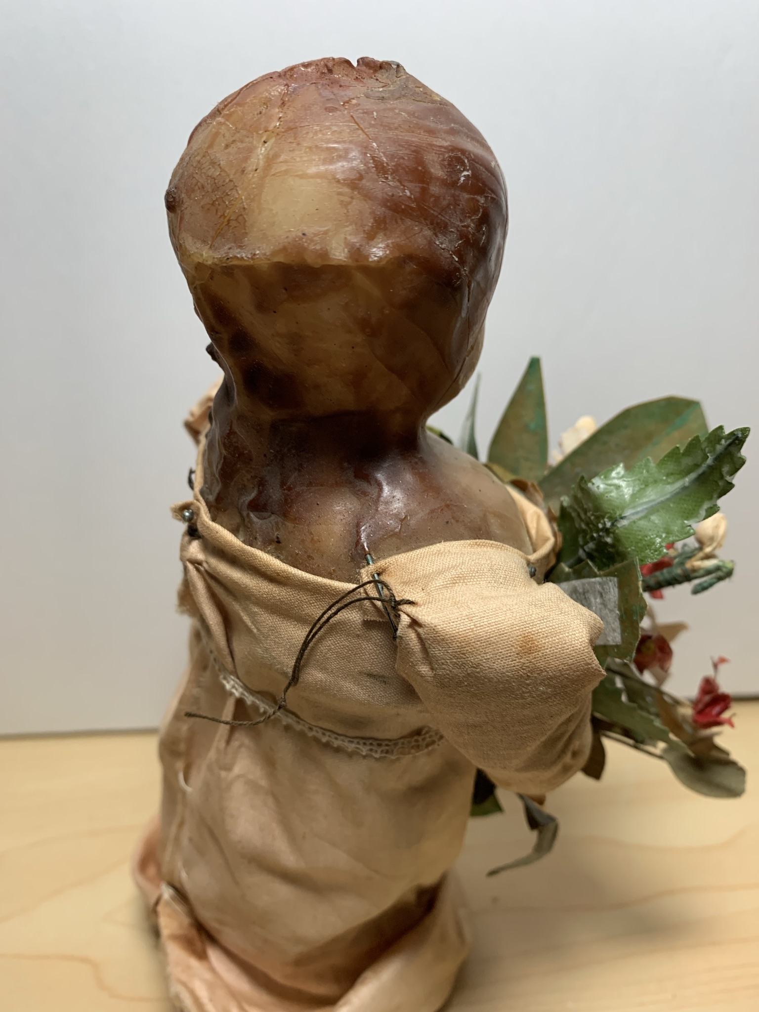 The little figure had survived quite an ordeal – well sort of survived.  She was still holding her bouquet made of wax and paper flowers.  Between the early auction picture and the current auction picture, I could see that the bouquet had slipped to a lower position.  Some of the delicate, folder paper petals and tiny wax stamens were in the rubble.  I attached these as best I could.  I had in my stash a beautiful, very old – maybe close to the same age group of paper flowers.  I decided to use some of these to augment her bouquet to bring it to a fuller look.  The added flowers looked perfect! Also, in the bouquet I left the original paper leaves and added a few new ones.