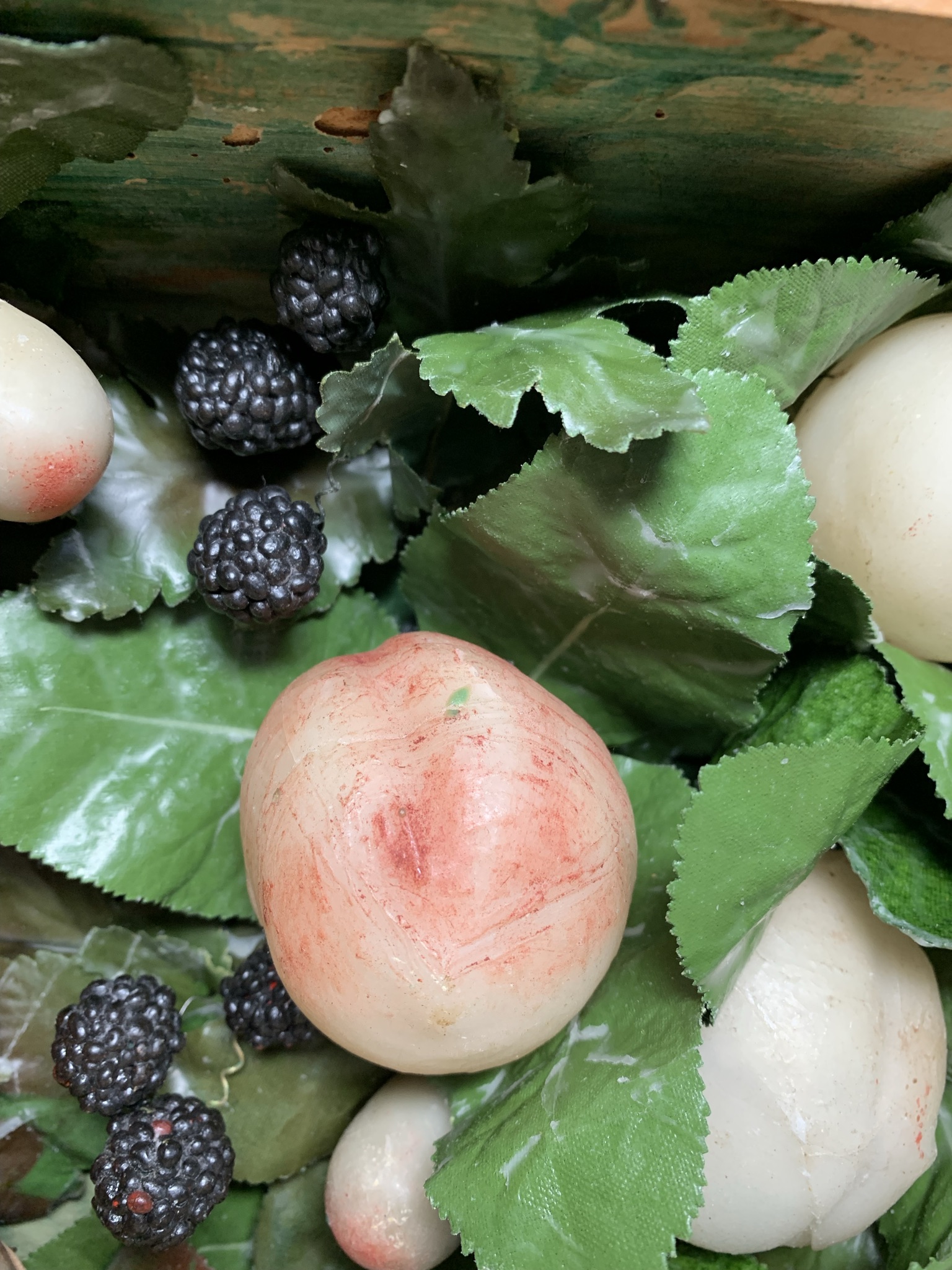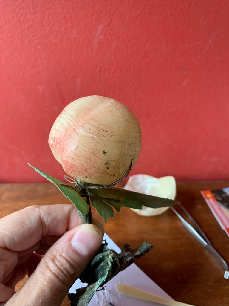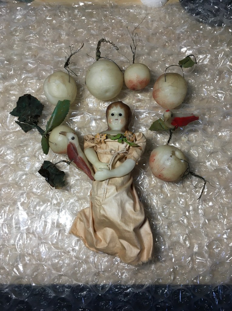 Based on the earliest picture, there are eight large pieces of hollow wax fruit – peaches, apples and one lemon.  Of the eight – six were detached and in smithereens.  The wax head of the figure was broken in multiple pieces.  All of the leaves were made of cut green paper dipped in wax.  Since the paper was so thin, old and brittle 98% of those leaves were in tiny pieces.  Both bird heads were broken, the sheep, which were simply formed and mostly solid seemed to fair the best.