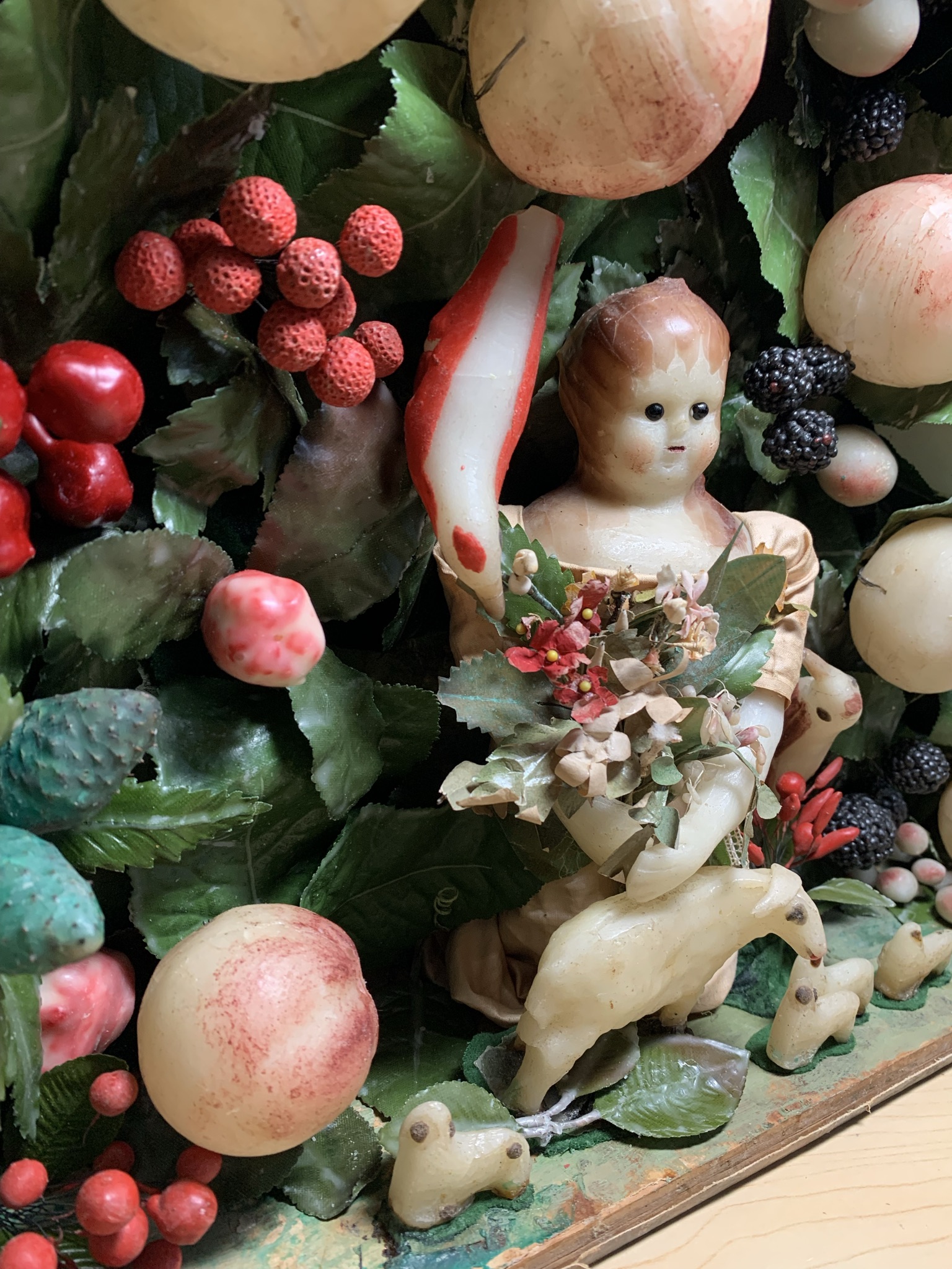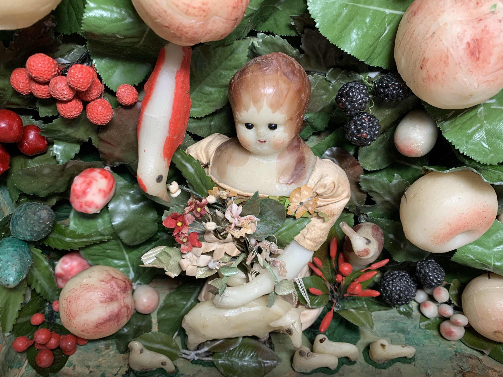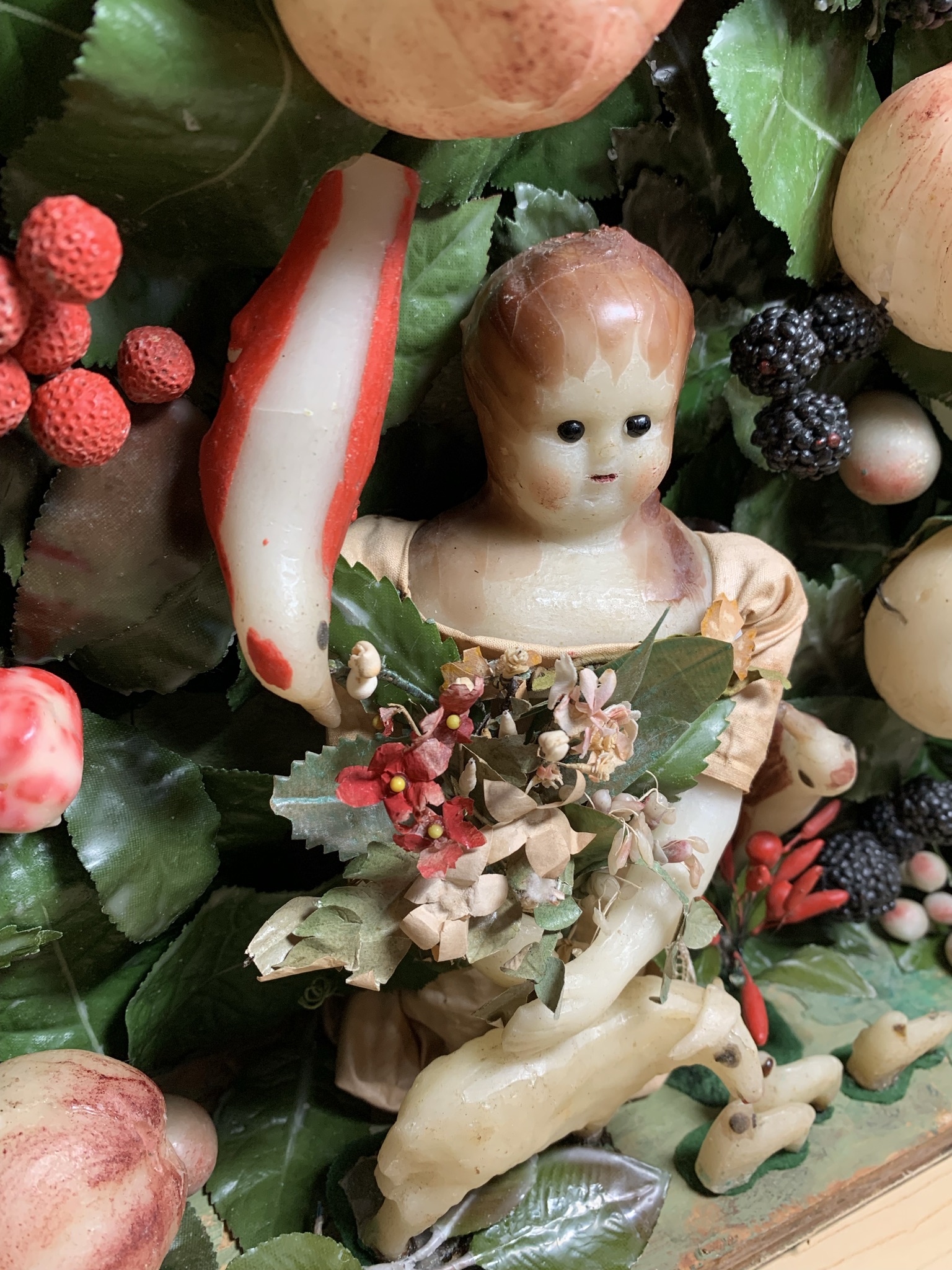I’m not sure where to begin.  If you read the previous post, maybe a better title would have been “I should have known better”.   I do believe I’ve learned my lesson this time, but here is the story.  I saw a charming diorama box at an auction that contained a wax figure in a lovely bocage setting surrounded with wax fruit and berries, birds and sheep. This was just the kind of thing I love, but the auction was on the opposite coast.  I pondered it and thought, well – if a few items come loose I can fix them again.