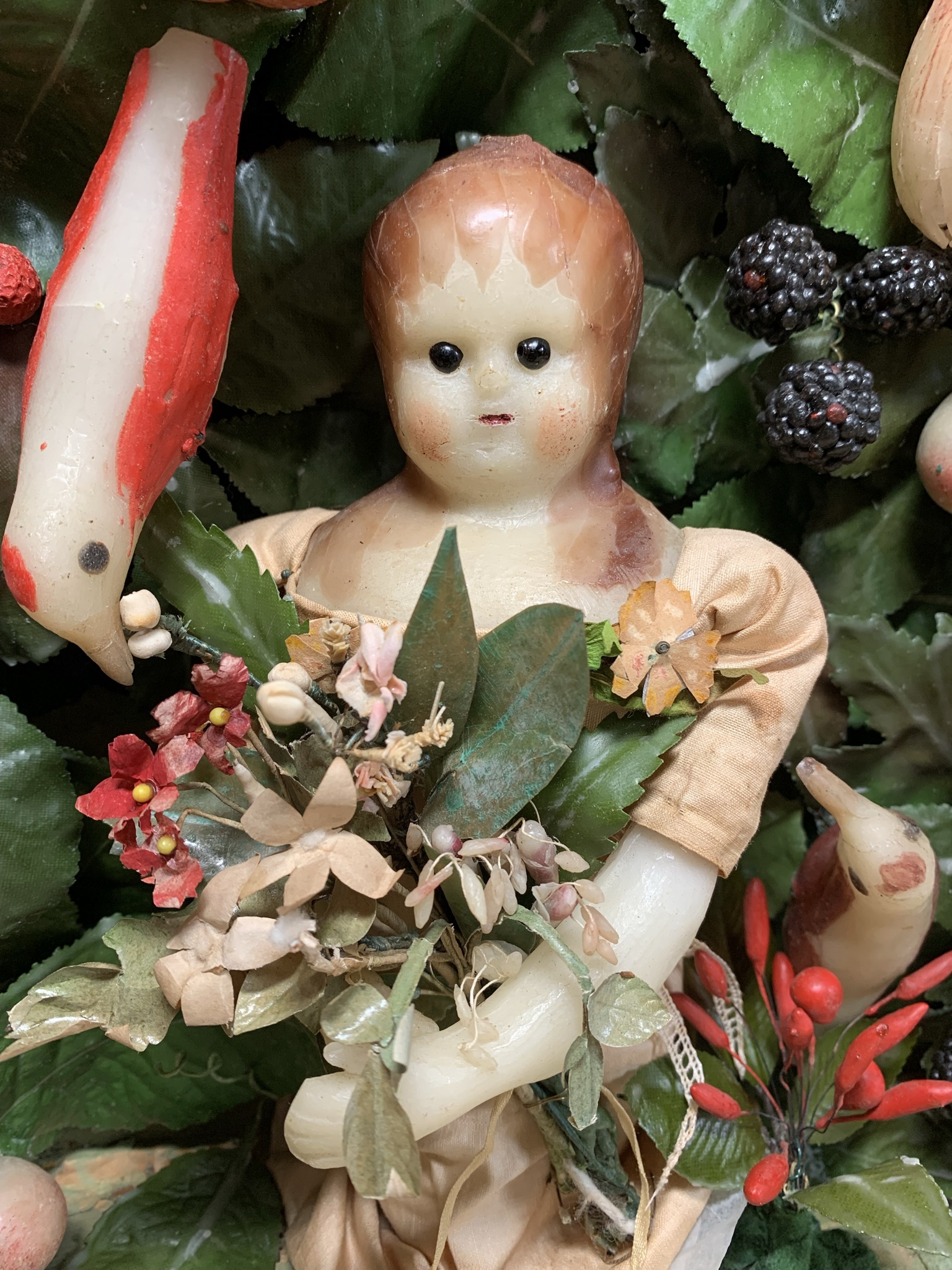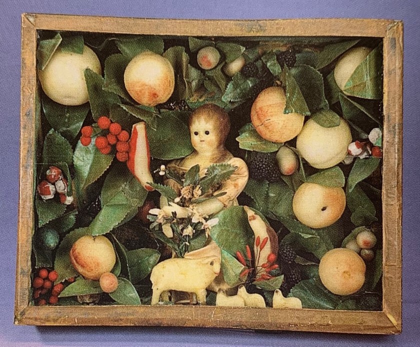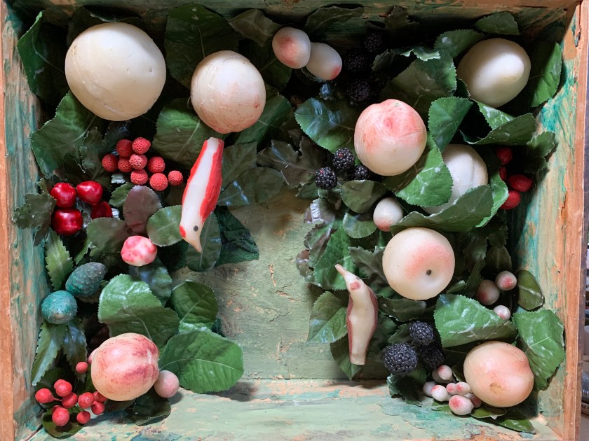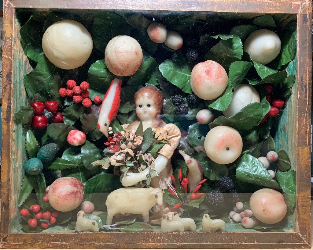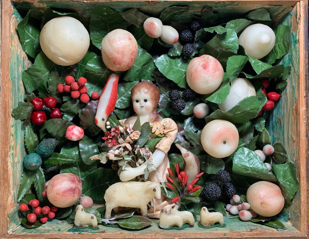 I’m not sure where to begin.  If you read the previous post, maybe a better title would have been “I should have known better”.   I do believe I’ve learned my lesson this time, but here is the story.  I saw a charming diorama box at an auction that contained a wax figure in a lovely bocage setting surrounded with wax fruit and berries, birds and sheep. This was just the kind of thing I love, but the auction was on the opposite coast.  I pondered it and thought, well – if a few items come loose I can fix them again.