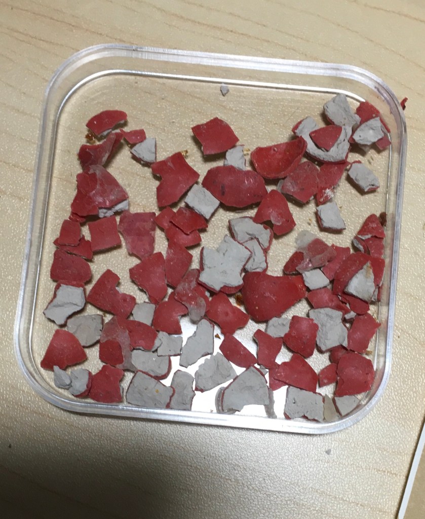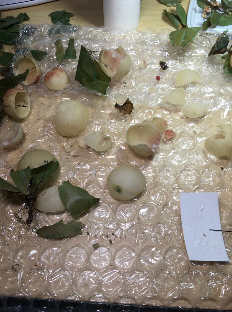 Next, I got out the sheep and birds.  The bird heads were both damaged.  The sheep were ok, with the larger one having some damage to front legs, however it did seem as though they had an old repair made with wood sticks, so that was odd.  The blackberries survived well as did some of the red wax berries.  There were other berries made out of a cement like substance that were originally covered with wax, but the wax was mostly broken off of those.  In looking at the earlier photo of the piece, that seems to have been already the case.  I got all of the largest pieces of the hollow fruit and leaves out as well to assess the mess.  Then sorted the rest of the wax pieces by size down to a pile of crumbs.  Nothing was discarded at this point.  From here, I had to begin to try to piece what I could together.