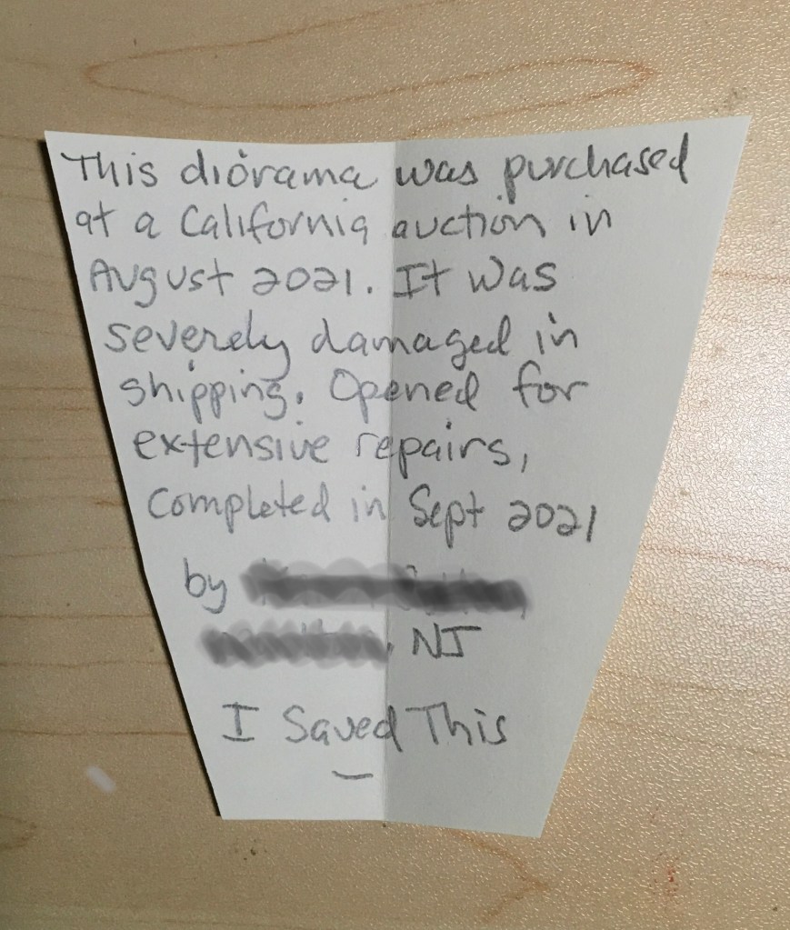 I arranged for shipping but was informed that there were a few loose items inside and they could only insure if the glass broke, not for items coming loose.  So, the box made a very fast journey.  I wish I had the wherewithal to take a picture when I first opened the package, but I think I was shocked by the utter devastation…worse than I could have ever imagined.  However, the glass did not break.  I think it was a case of the old glue giving way, as it had in the other box in the previous post – only this time with even more disastrous results!  Along with the box, came an older printout of a photo of it from an earlier auction.  From that picture to the current photo online, I could see a few of things were detached already and had some minor damage, but this was WAY worse.