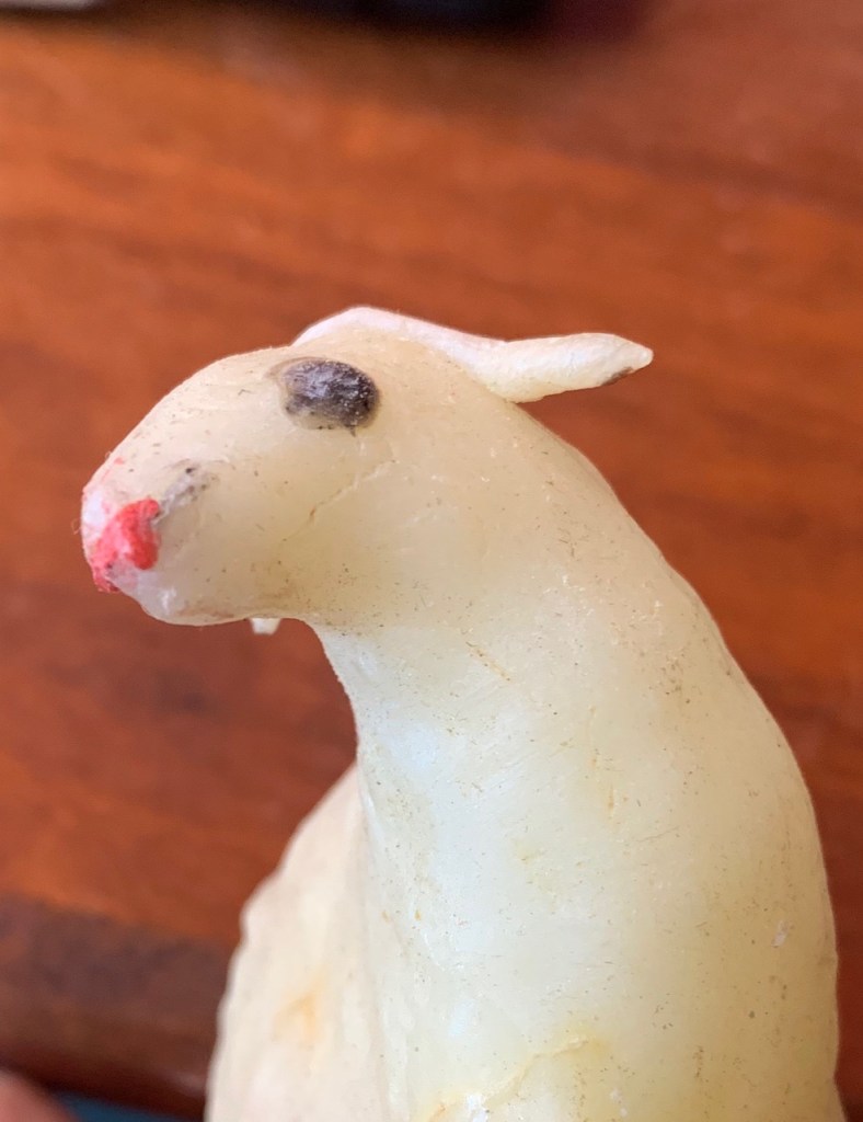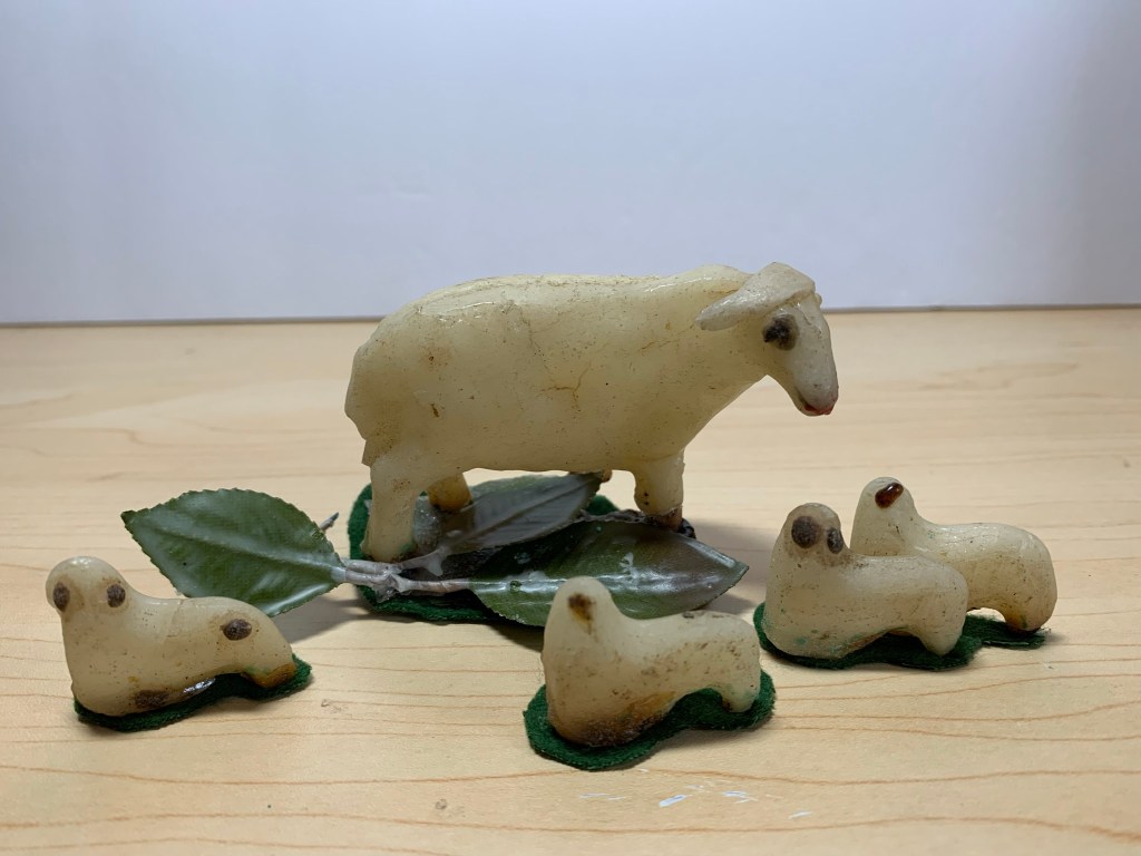 I did find some evidence of the work that Estelle and Evelyn may have done when they opened the box in 1948.  It appears that there were hooks to hang the box originally, and that they removed the back of the box.  They also may have put tiny holes in the back and fastened some of the objects with wire that tied outside of the box.  The figure and a few of the bunches had this.  I also found some clear wax drippings that were different from the other waxes.  They may have been the ones to reinforce the legs of the ewe with wood sticks since the wax pieces for these legs and the tail were not to be found in the box.  Speaking of the ewe, the previously mentioned tiny piece of wax that I originally thought was the thumb turned out to be the ear!  This was an older break, and I really couldn’t tell the ear was missing – mystery solved!