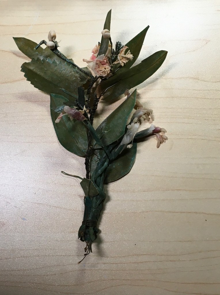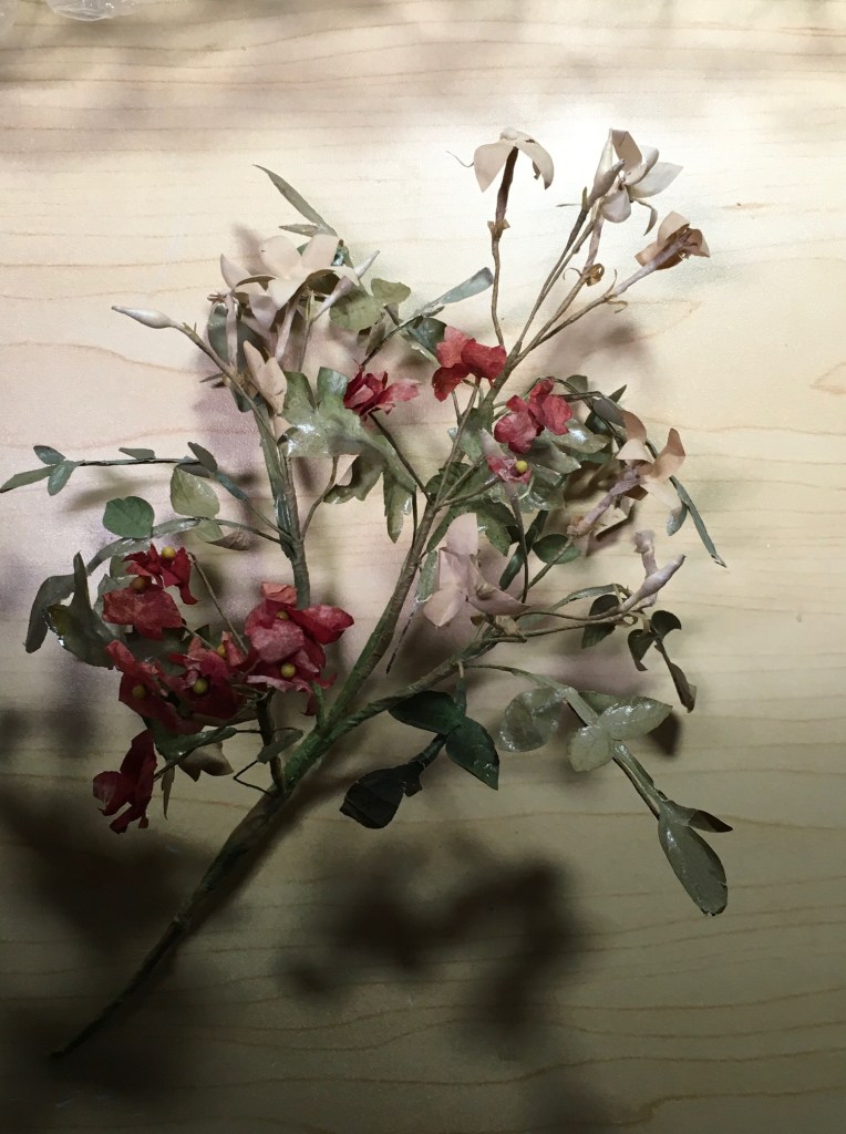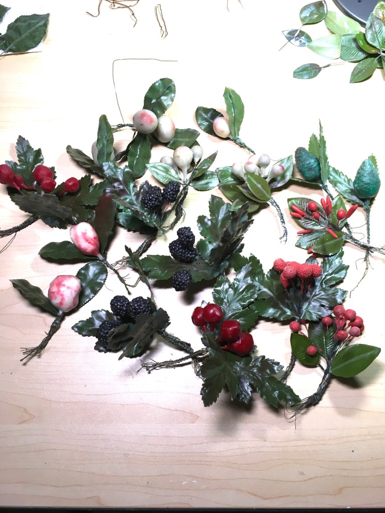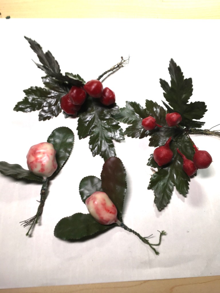 There are five bunches of red berries, and three bunches of blackberries and several bunches of tonal cream and peach berries – large and small.  The red bunches with the smaller berries were fine, except for the leaves.  The larger red berries were missing most of the wax.  These were made of cement like material.  This was also used for two larger items that were streaky pink.  I’m not sure if there were meant to be buds or small fruit since they had lost most of the wax and one had crumbled to pieces.  I formed one new bud from paper clay and removed the bits of wax from the other, and patched the missing area.  There were two green waxed objects that look like maybe some type of pinecone – they were fine except for the leaves.  Also the tonal wax berries were all ok except for the leaves, of course.  I was able to get dye to make the red wax that was needed for the two berry bunches and the streaky buds.