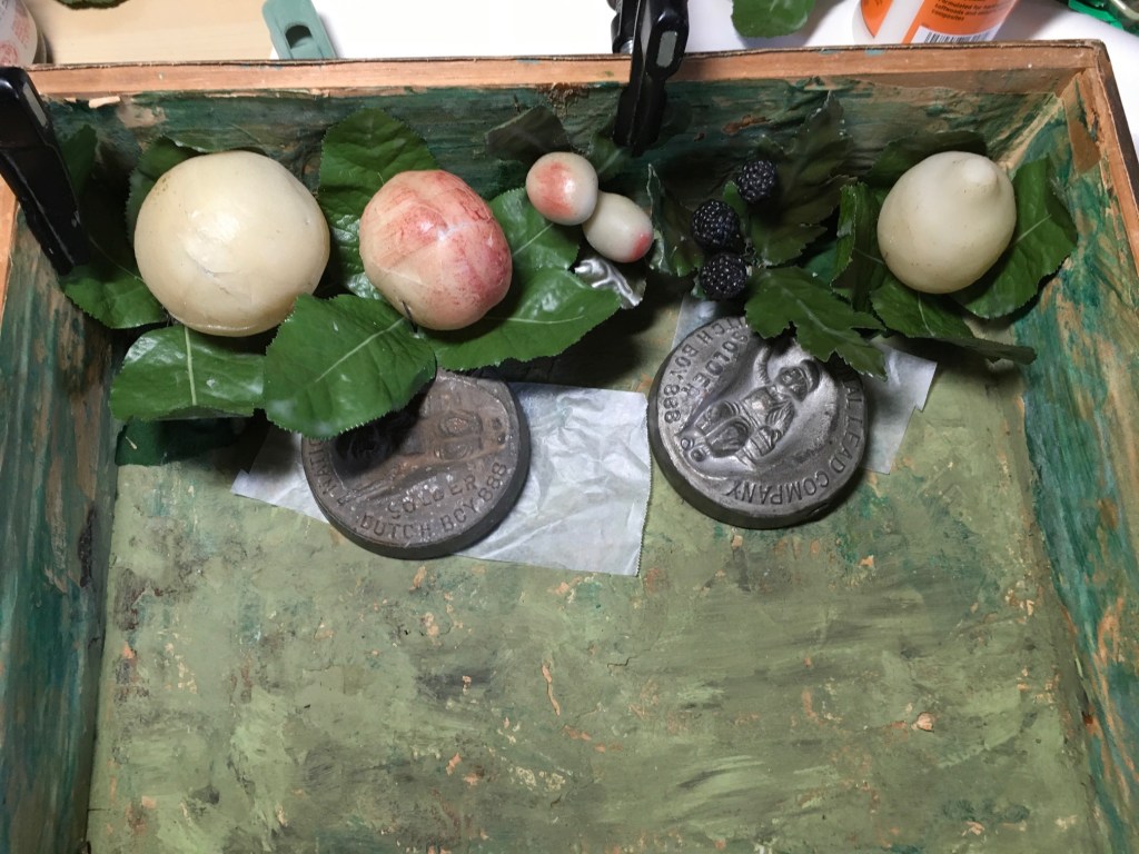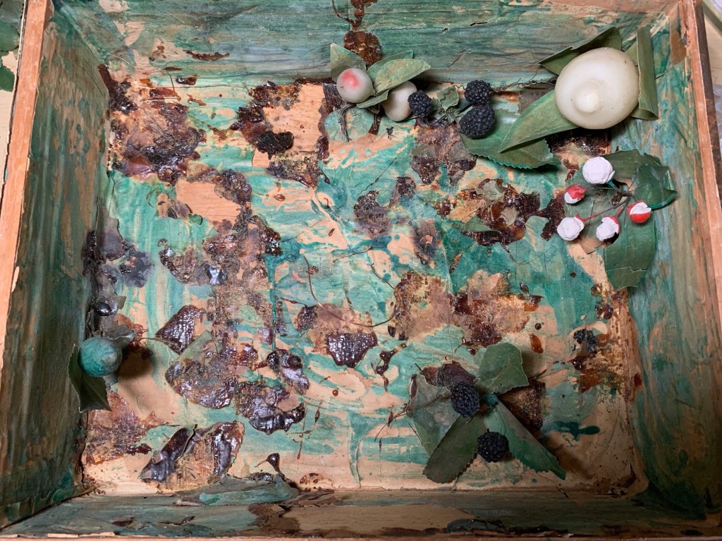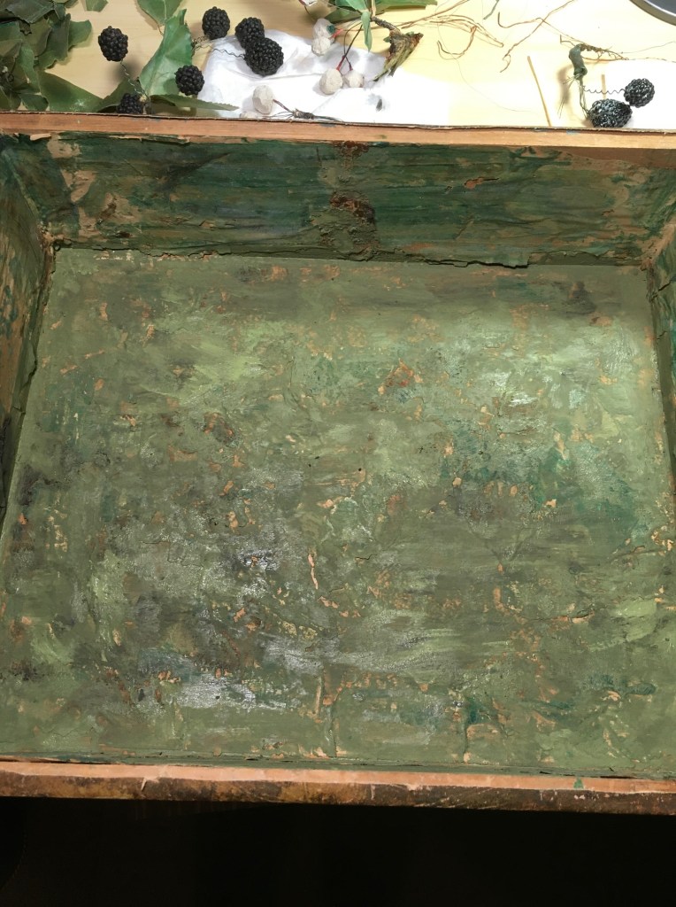 The old glue was removed, box was gently swept clean and the fruit and berry bunches assembled with new leaves.  The figure, birds and sheep were dusted and repaired as much as possible.  Now it was time to reattach everything!  The interior of the box was lined with thin paper that had a light wash of green paint over it.  I was worried about attaching to this paper since it was brittle and coming off pretty easily.  I decided to remove all of the loose paper in the back of the box so that the glue could hold directly to the wood, and not come loose if the paper peeled off.  I added a few strokes of dry green chalk paint to mimic the color that was previously there.  I left the paper on the sides intact since nothing gets attached directly to the sides.