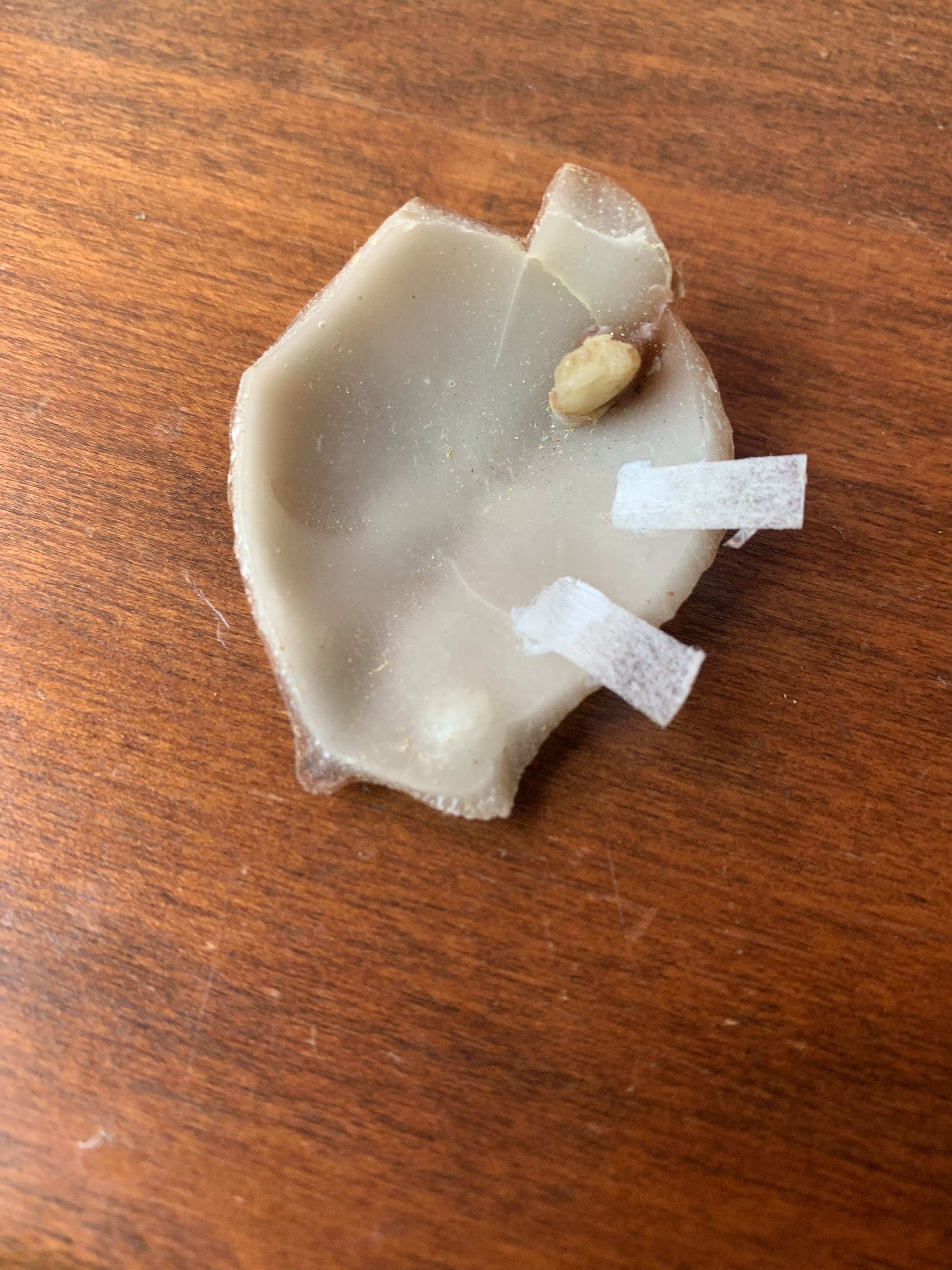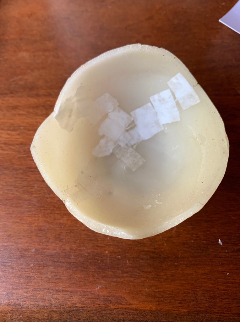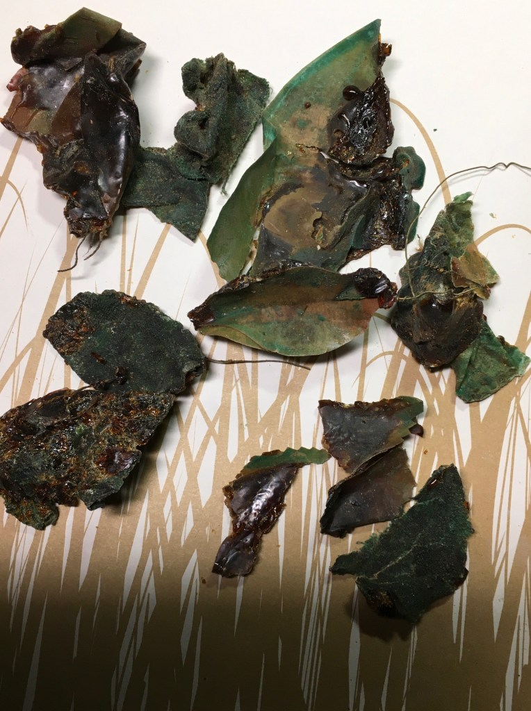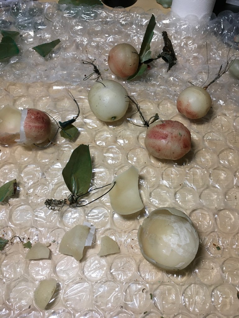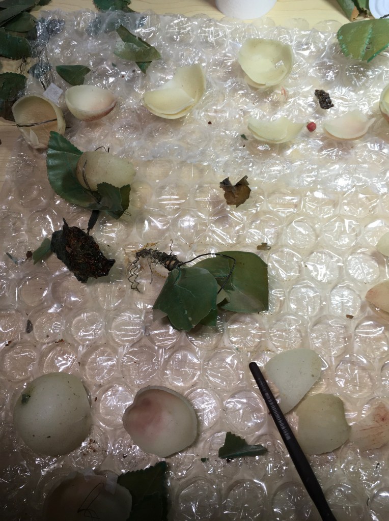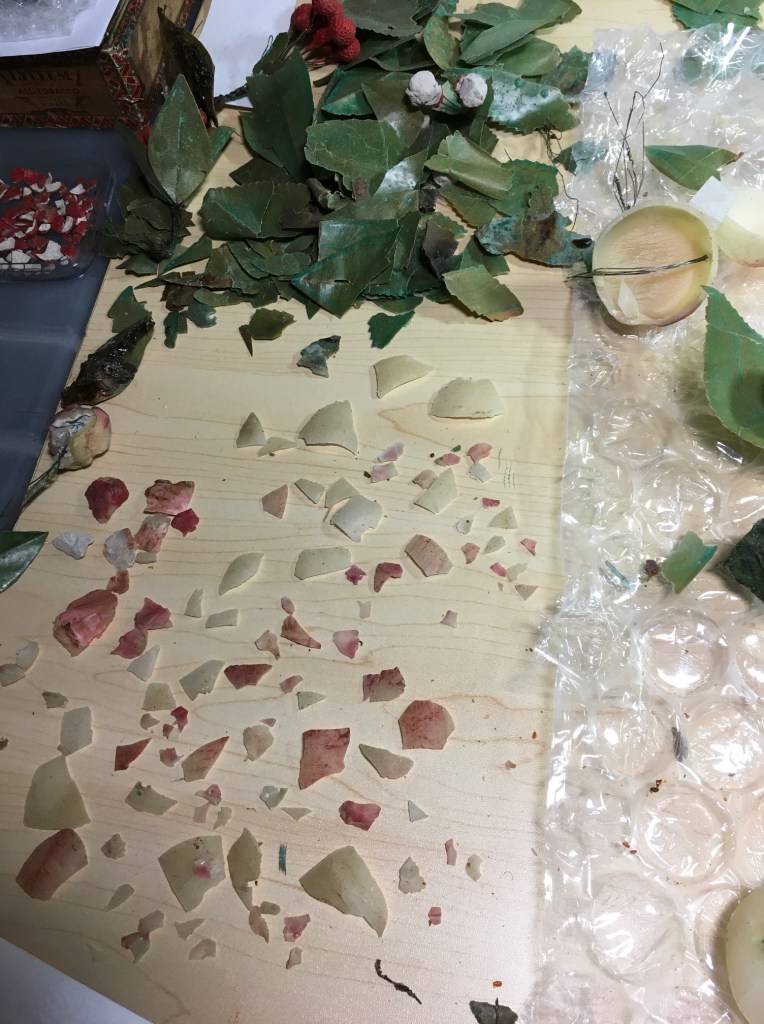 I really felt bad about this.  Not just because of the cost, but because this unique piece was so severely damaged, when keeping things preserved is so important to me.  I stared at the big crumbed mess of wax and broken leaves for about 5 minutes and decided I had two options – discard it, or to at least attempt to fix it.