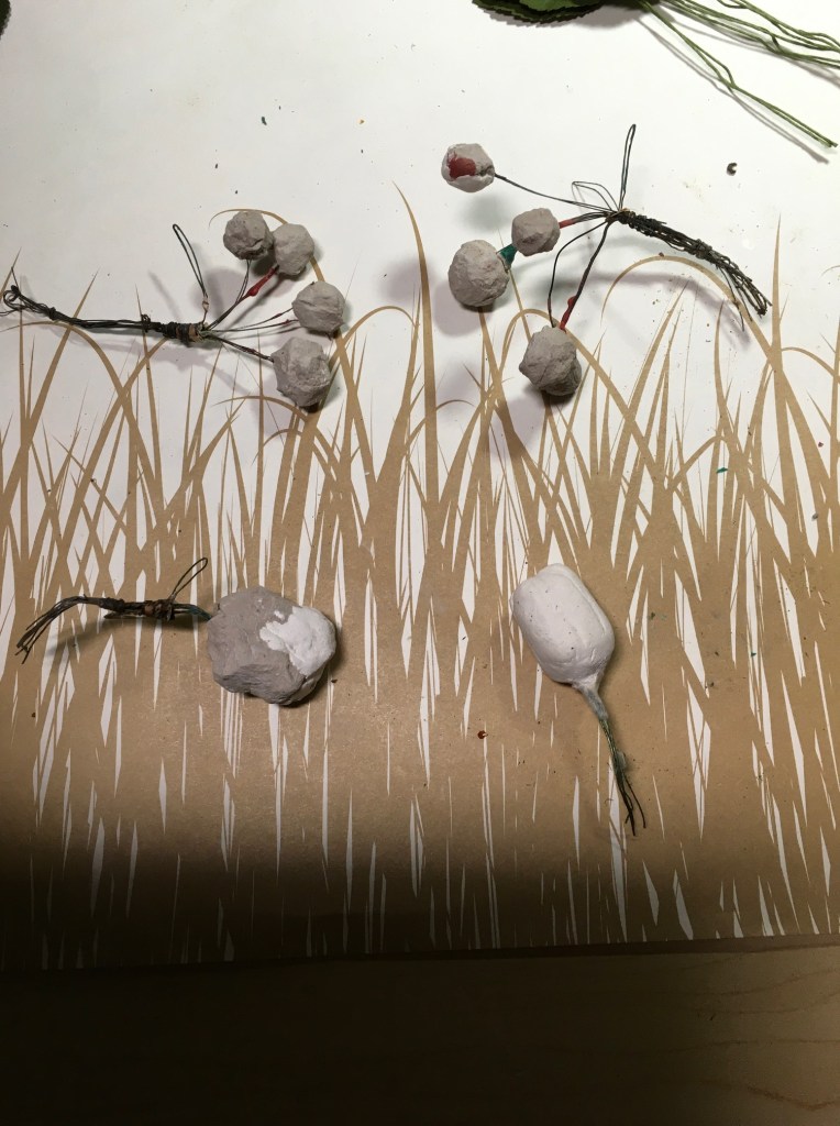 The blackberries held up surprisingly well (you know – except for the leaves).  They are made of tiny beads of wax over some type of base.  Only one berry was loose and some of the beads came off.  I was able to put this back on the stem and reassemble the beads.  As a precaution, I coated these with matte polymer, that I dusted up just a bit to hopefully keep them from shedding the tiny beads over time.  These honestly look good enough to eat!