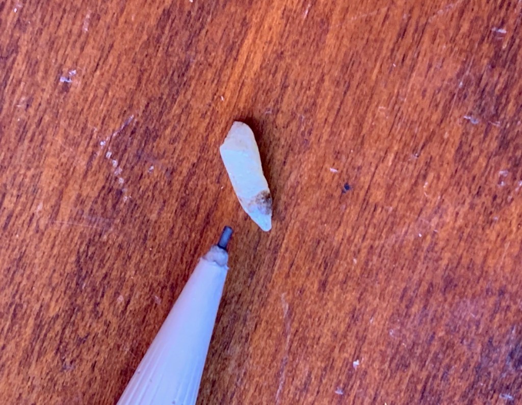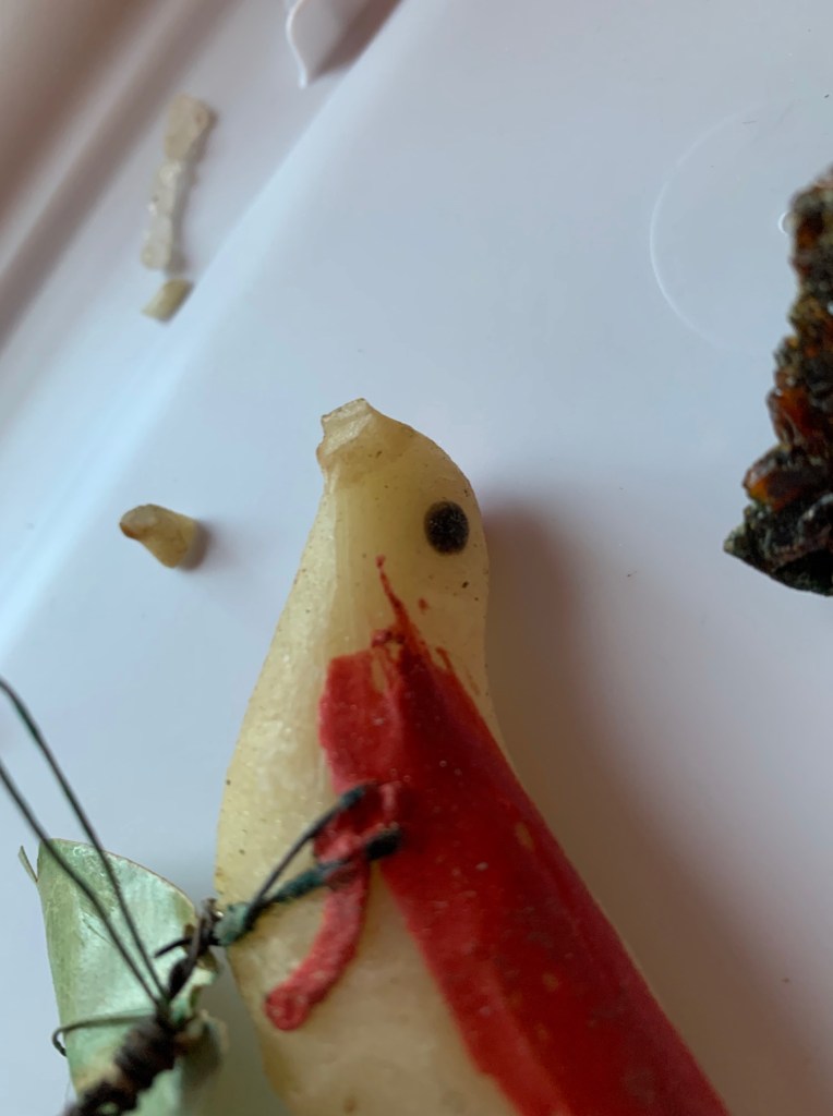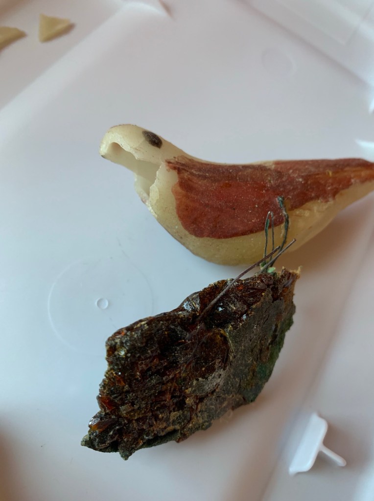 After the figure, I went on to try to fix the birds.  One was just missing his tiny beak, the other had more damage to the head impacting the beak, eyes and neck.  It was difficult finding the beaks.  They were open so each beak was two pieces.  While I looked through the wax rubble for these I was also looking for the thumb.  Finally, I found all but one piece of the birds neck, but still no thumb.  It was a clean, new break but where could it be?  Keep in mind, this piece was just about 1/8 inch in length!  I found several pieces I thought could be the thumb, but none fit.  Finally, after sifting through the smallest crumbs, I found it – the clean break fit perfectly!  So, birds and figure were together.  I had one tiny piece that I was sure belonged somewhere, but it wasn’t part of the birds or the figure.  It was put aside for safe keeping.