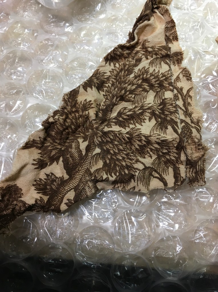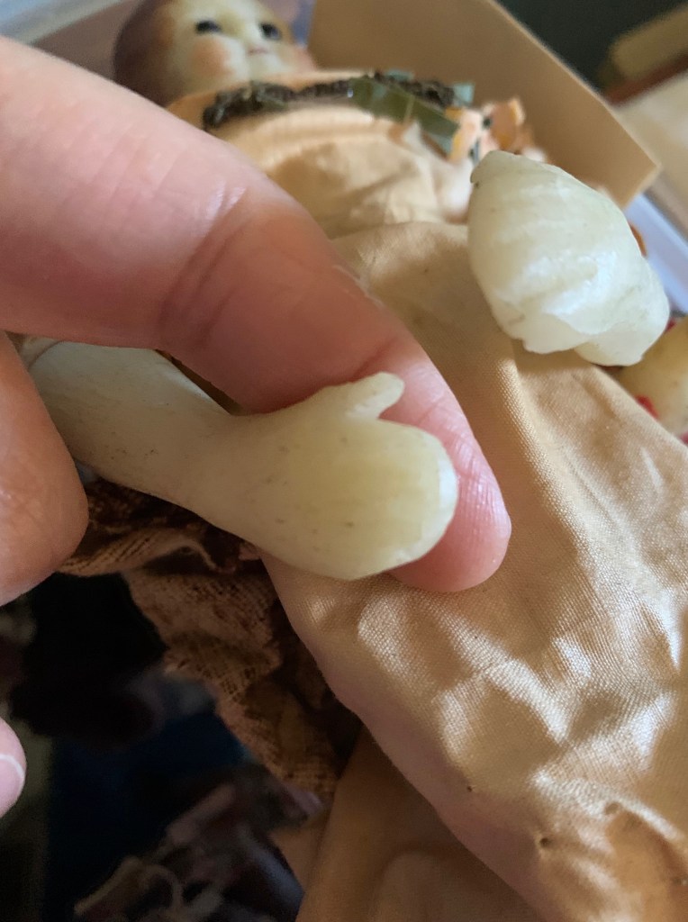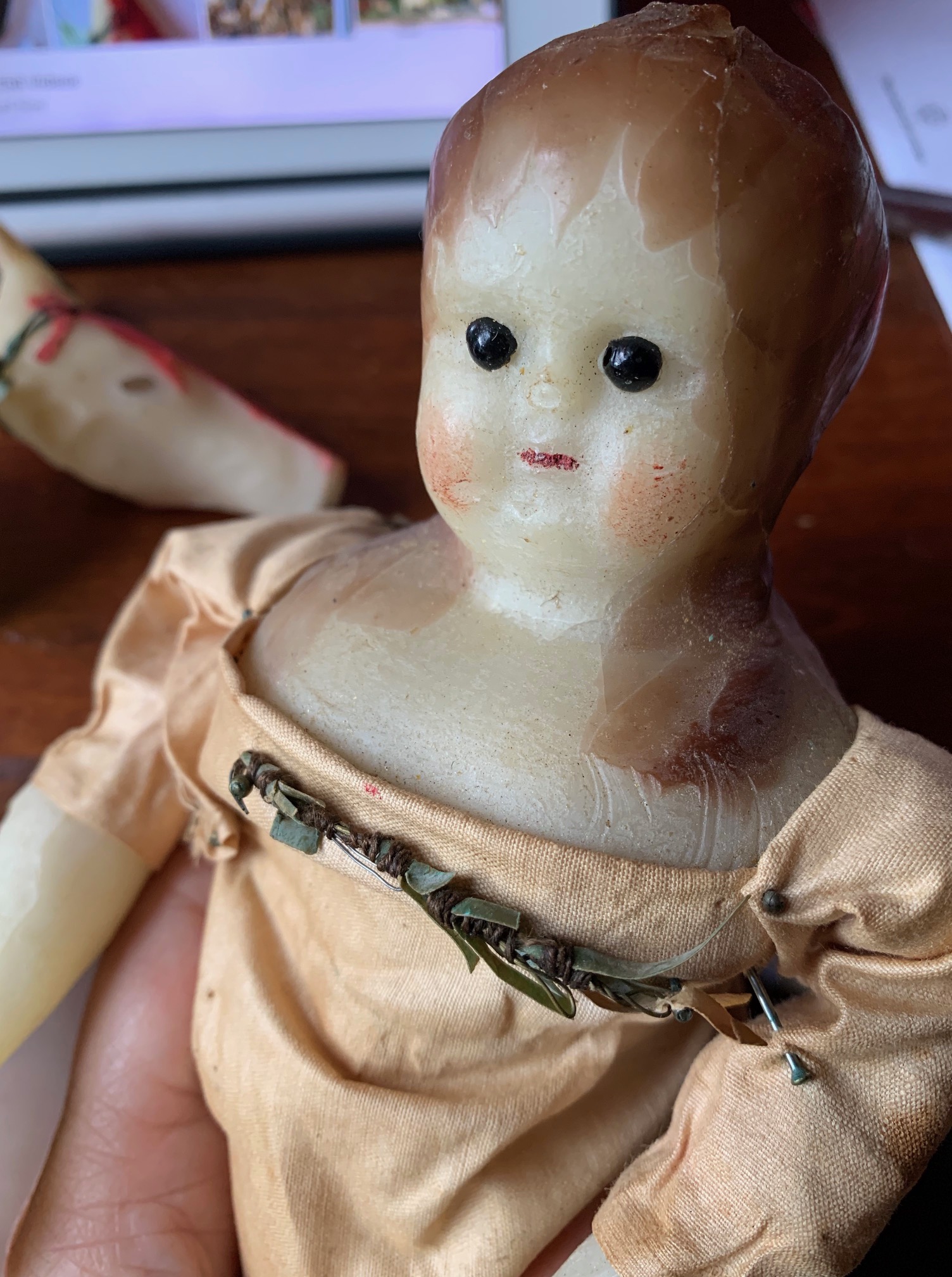 They are on top and not easily seen so that was fortunate.  I was able to fill the small spaces with glue that I mixed with pigment, and they really are invisible – you can see this area circled in green in the photo above. Naturally, I took the chance to examine how the figure was assembled. She has no legs, but is just simply made of rolled cloth with a fabric dress pinned on, and she was placed in a kneeling position in the box.  Her wax lower arms are just wrapped with the dress fabric sleeves and pinned to the top.  The dress has faded to a creamy color, but looks as though it may have been very pale pink at one time.  She had fabric scraps stuffed to give the dress some shape, one being an early piece of printed fabric that is like flannel.