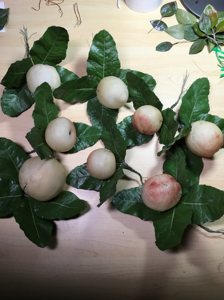 In cleaning the interior so that things could be fastened again, I discovered that the groups of fruit and berries were wrapped with pieces of green cloth, maybe like flannel or velvet.  The cloth was arranged in such a way as to create a base that would hide the wires and make a nice green background.  The existing cloth was brittle with wax and glue coating, so I removed this and got new flannel to use the same type of attachment.   I had to get rid of as much of the old glue as possible and so I removed the bunches of fruit that were still attached (there were 6), so that I could do the same and reinforce them so that they wouldn’t come loose eventually with the old glue.