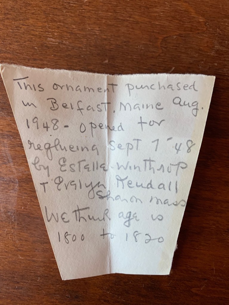 This ornament purchased in Belfast, Maine Aug. 1948 – opened for reglueing Sept 7 ’48 by Estelle Winthrop & Evelyn Kendall, Sharon Mass.  We think age is 1800 to 1820.