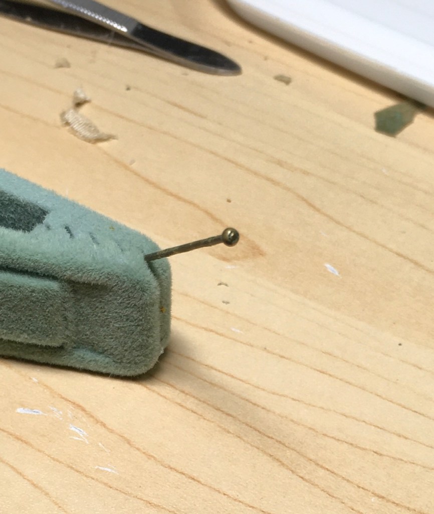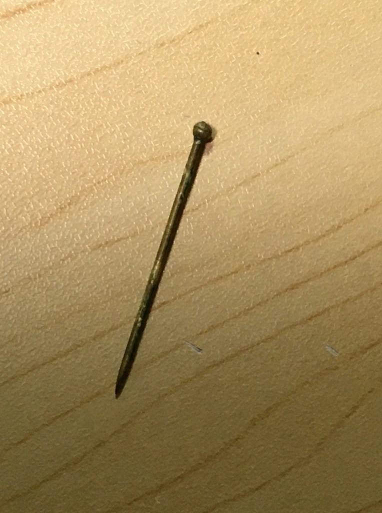 Along the top of her bodice, she had a sprig of greens attached with pins.  On one pin was remaining two paper petals.  The other pin was blank, and the thin wax leaves were mostly broken off, so basically she now had a piece of wire pinned to her bodice.  I did find the paper petals, they were all made from pieces of cut paper and had much faded hand painted designs on them – so simple but charming.  I reinforced the flowers and pinned them back on.  I augmented the sprig with some newer paper leaves I had.  Just a note on the pins.  These were heavy, brass pins with separately applied heads.  Straight pins were not made by machine yet, and were kind of a luxury item.  I couldn’t resist including a picture of this early pin design before replacing them.