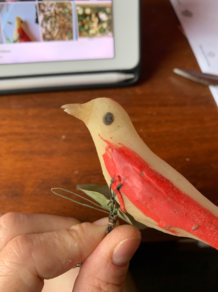 I had to decide if I was going to try to keep the few that were ok, or would they just break soon?  I got some vintage, unused cloth millinery leaves of good quality.  I was either going to use them as they were, or got the idea that I could wax coat them.  I’m not sure this was value added, and it certainly added a lot more work to the project, but I coated all of the leaves in beeswax.  I first ran a test with soy wax, but read it could actually rot over time due to what it’s made from.  Paraffin seemed a bit dangerous, so I went with beeswax.  I got several types of leaves, of course not exactly what was originally there, but I tried to get things close in size or feel.  I did not keep any of the original leaves in the box, but they are in the bouquet that the figure is holding.