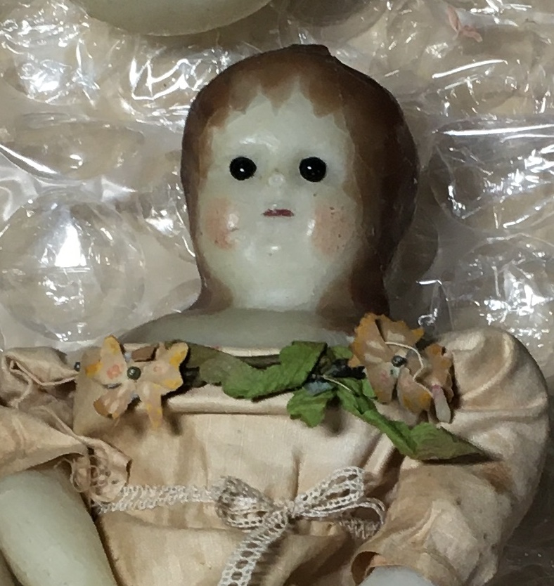 I was sort of overwhelmed by finding the note.  I received the box in August – the same month that Evelyn found it 73 years ago.  All three of us feel the same as to the age of the item.  Both Estelle Winthrop and Evelyn Kendall were early collectors with wonderful dolls that have subsequently been added to other collections – the ladies must have been friends.  I’ve seen dolls in my early books attributed to their collections – I believe the Winthrop collection was auctioned in the late 1970s.  I did some research on Evelyn Way Kendall and there was a good bit of information available.  Briefly, she was born in 1893 and passed away in 1979, Evelyn was a nurse and an avid collector of many things.  She established the Kendall Whaling Museum, the Evelyn Kendall Ballooning & Early Aviation Collection and the Kendall Doll Museum. It appears she also collected folk artwork made with seashells, which is something I currently have a great interest in  – I certainly would have liked to have met her!  The Kendall Collection was auctioned by Sotheby’s in 1999.