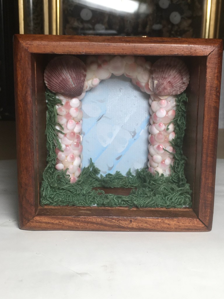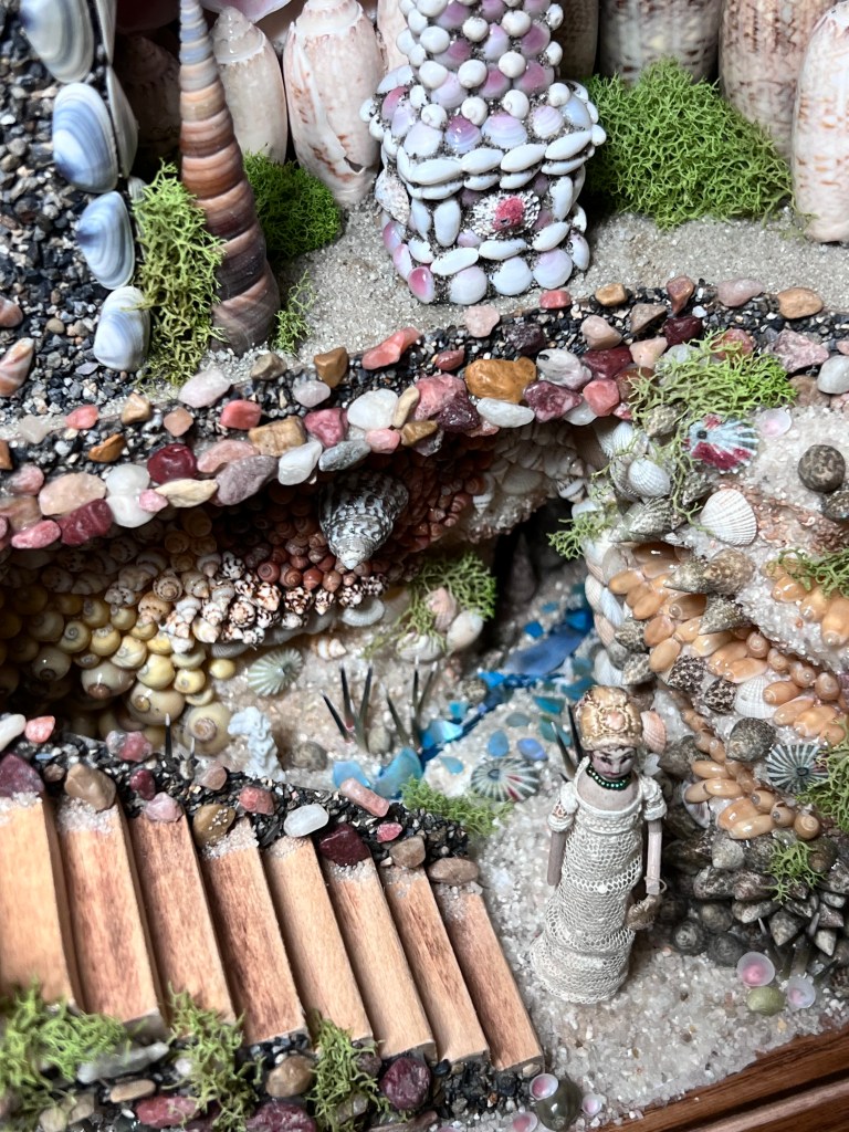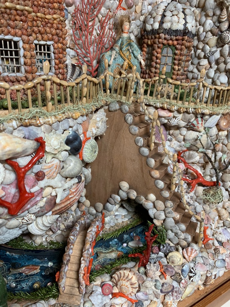 The custom made box has interior measurements of 14 x 12 x 6 inches (smaller than the examples that inspired it). This was started in the fall of 2020 and finished in March of 2021. It features a Georgian styled shell decorated house along with a gazebo/summer house which are elevated to a second level in the scene with a wood/shell stairway down to the lower level. On the lower level is a glass covered waterway that runs between two covered areas. There is a small coral adorned bridge over the waterway. One of the figures is on the top and the other by the bridge below. Some of the boxes are titled and this one is “Look for me at the Coral Bridge”.