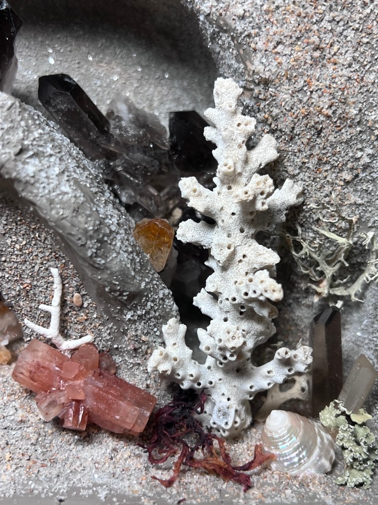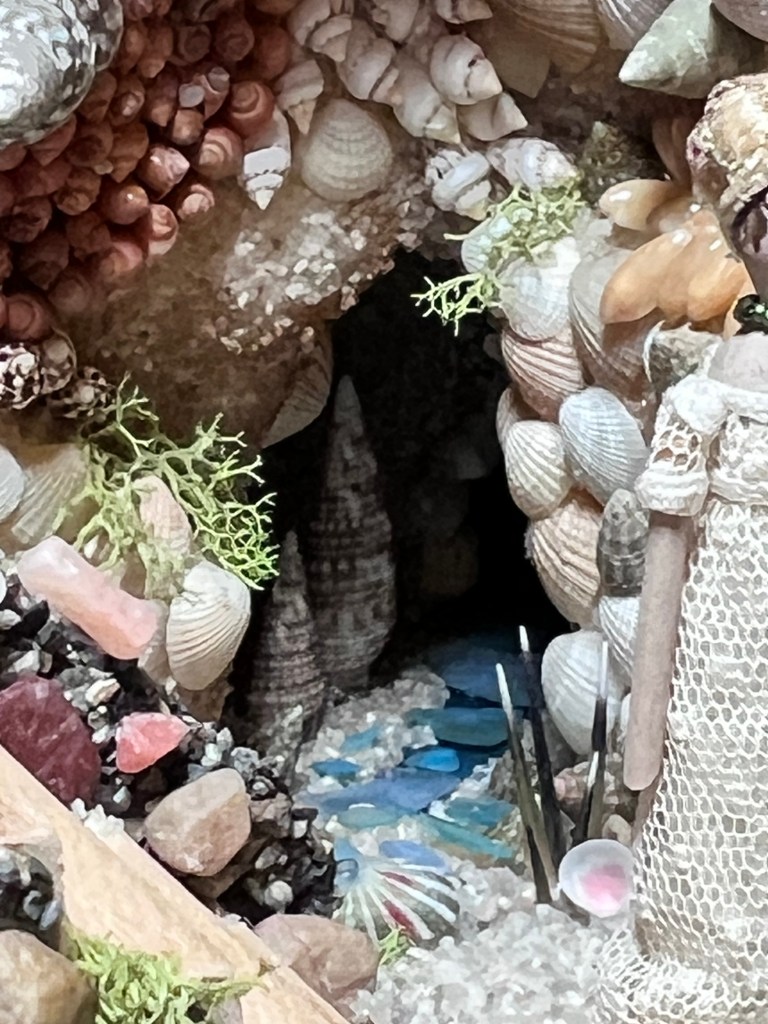 I have a fascination with 18th and 19th century dioramas, shellwork and grottos. I love the use of natural items to create miniature worlds. Long before the internet and before I had seen an 18th or 19th century version I had assembled boxes of found natural objects. Shells and things of the sea have always called out to me, but also rocks, feathers, seeds, lichen – so much beauty to be found in these objects.