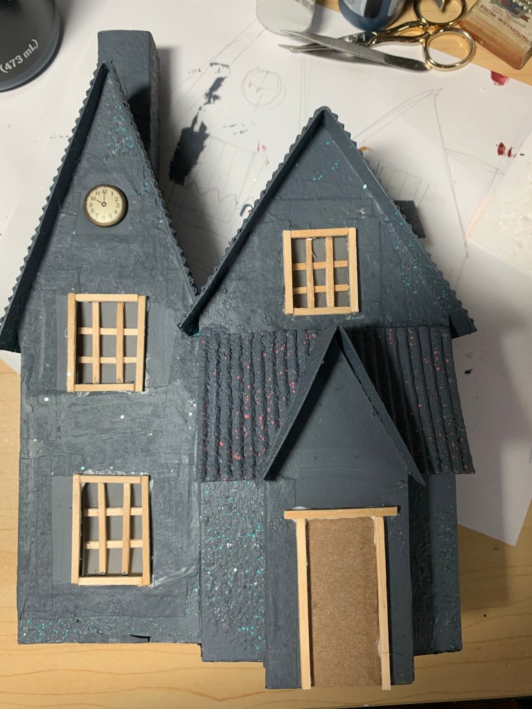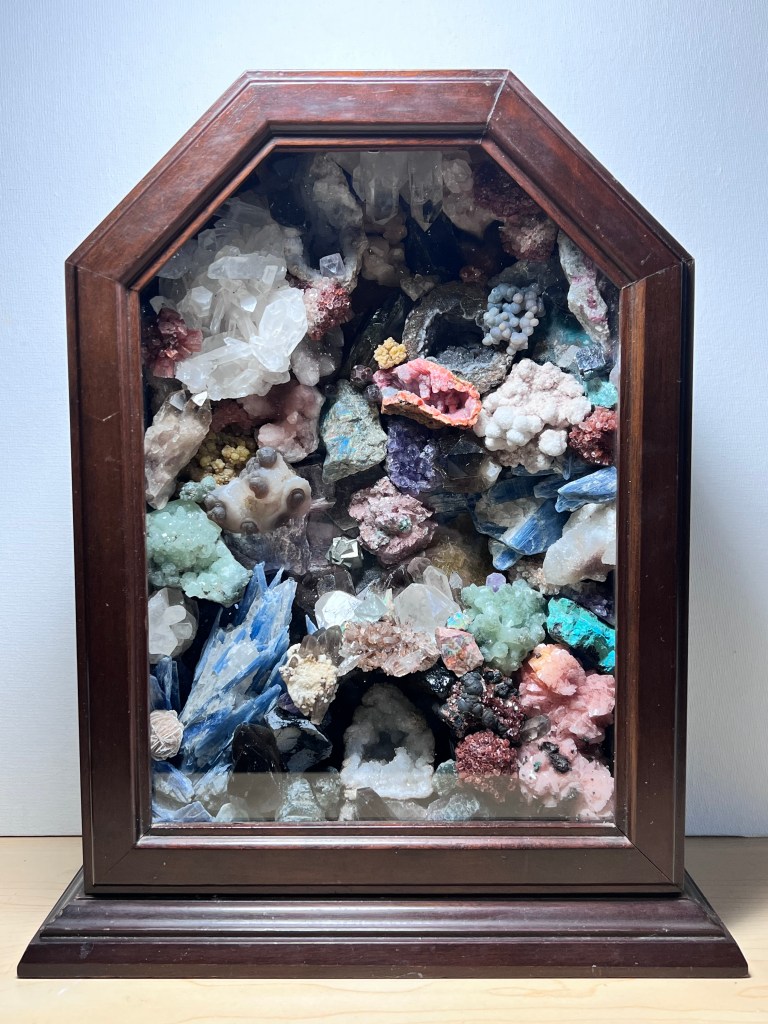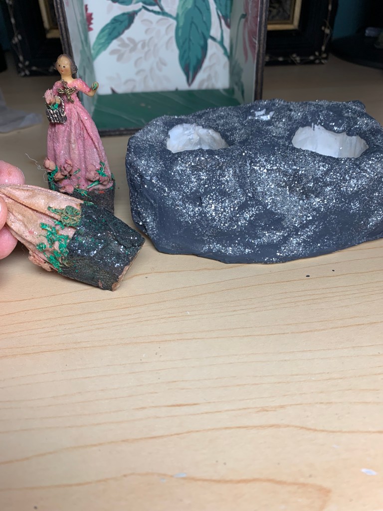 The last piece I’ve worked on so far was another crystal/mineral piece. I still had some specimens left from the earlier box, but stumbled upon a source for some really nice pieces that were super reasonable – so I couldn’t resist getting them. I’d seen a few 19th century pieces – they are generally formed on an obelisk or into some type of architectural structure. I saw one piece beautifully framed, so I decided to go that route. I found a broken clock and used the case for the frame. This piece also has a light source lighting a crystal formation on top and the sort of grotto portion at the bottom. I love all of the beautiful crystal and mineral specimens – this one is also very heavy! Unfortunately, photos just don’t do the minerals justice – they are amazing in person.