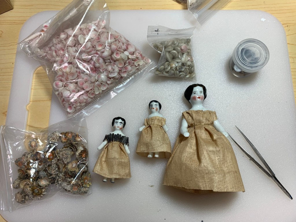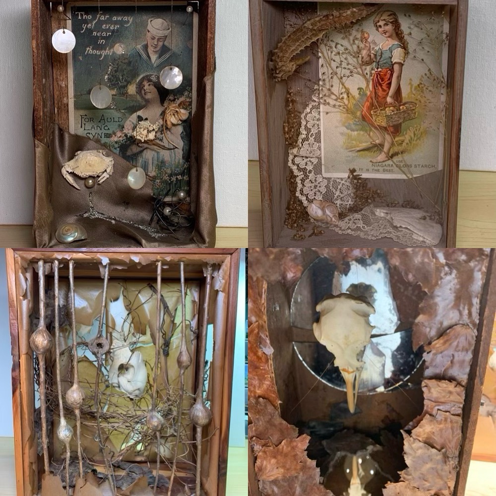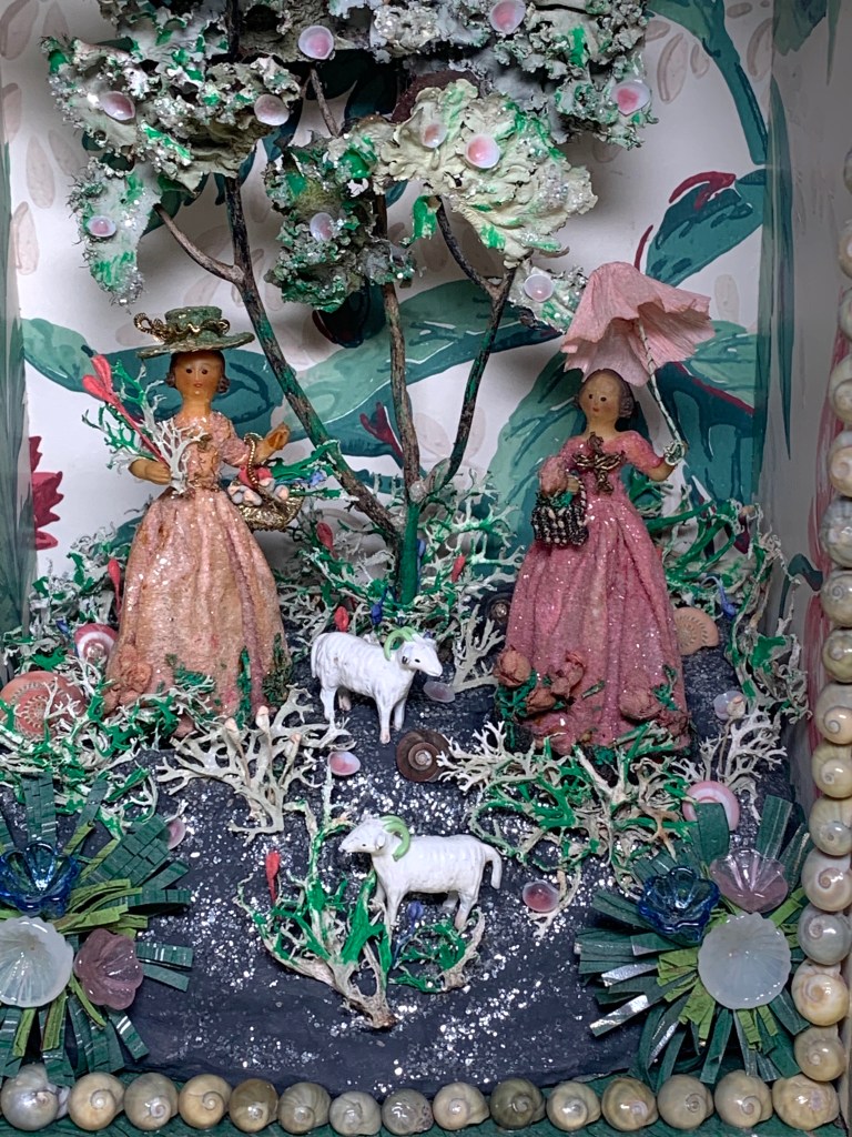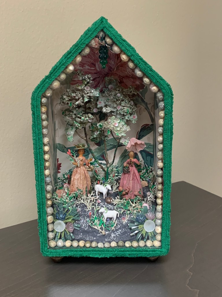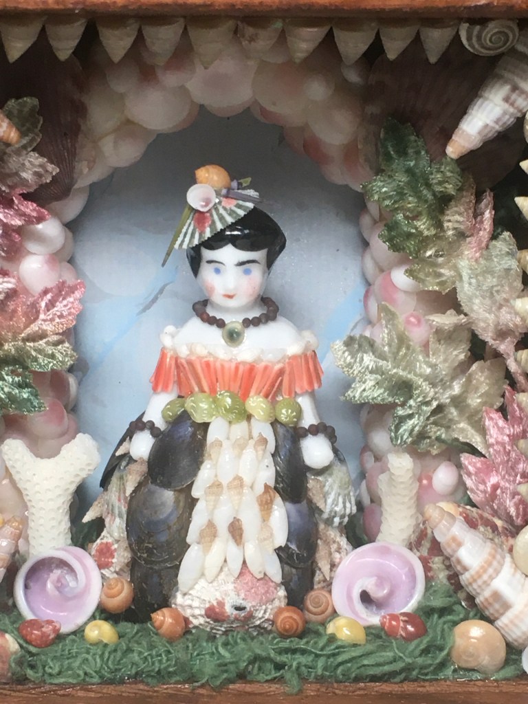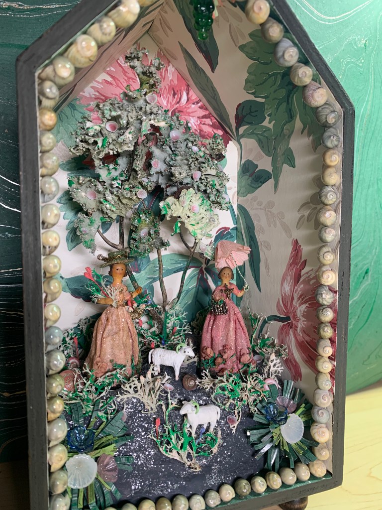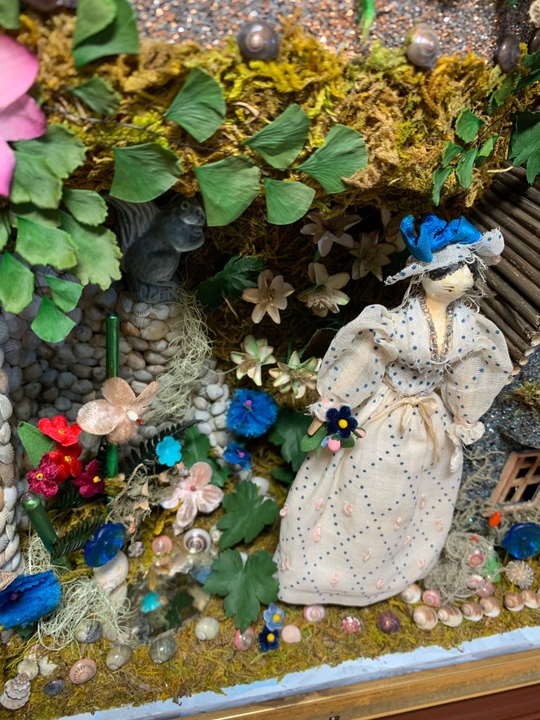 So far, I have made 13 shadow boxes, dioramas and shell scenes inspired by antique versions that I’ve seen. Many of them incorporate antique dolls since this has always been an area of interest. Here are some of the boxes that have been made since 2020.