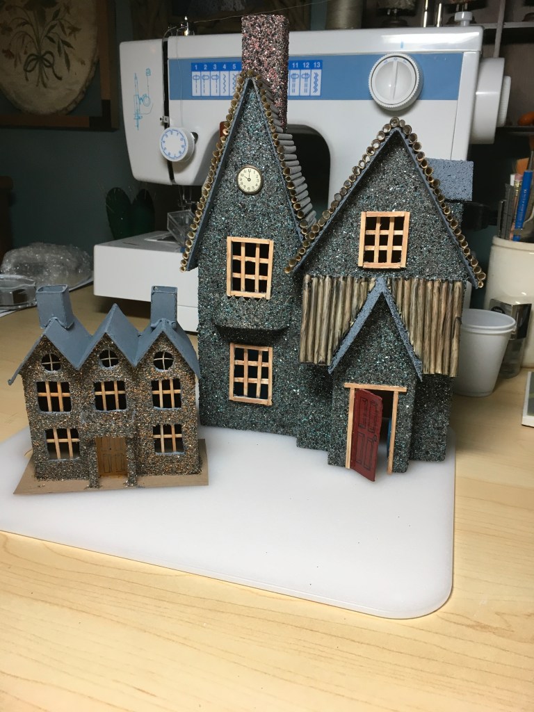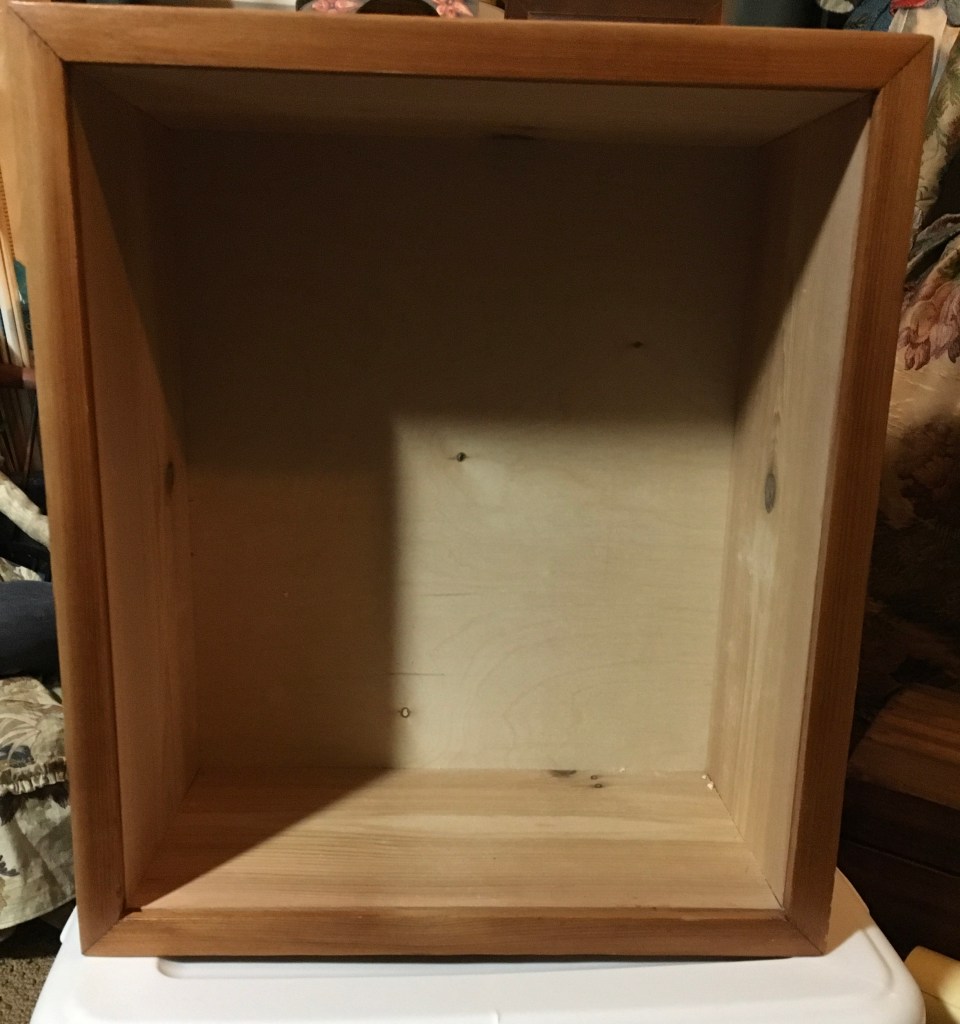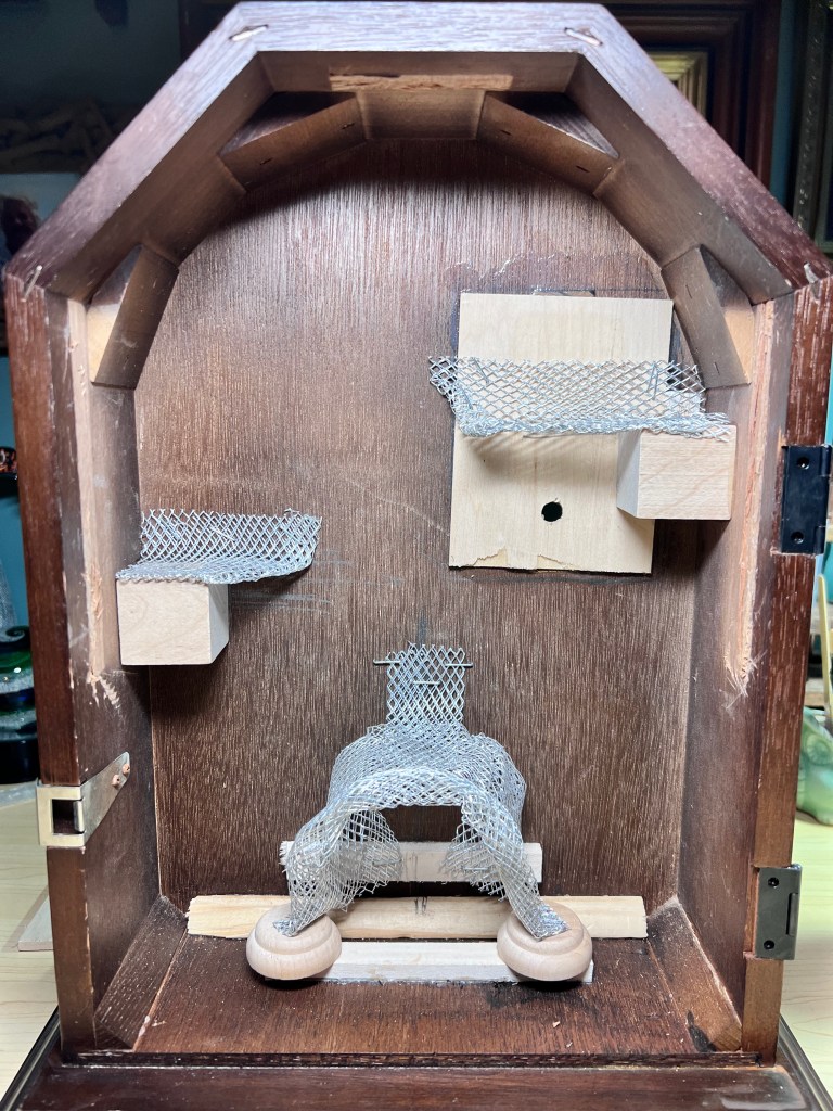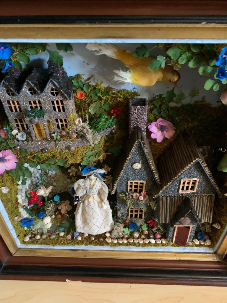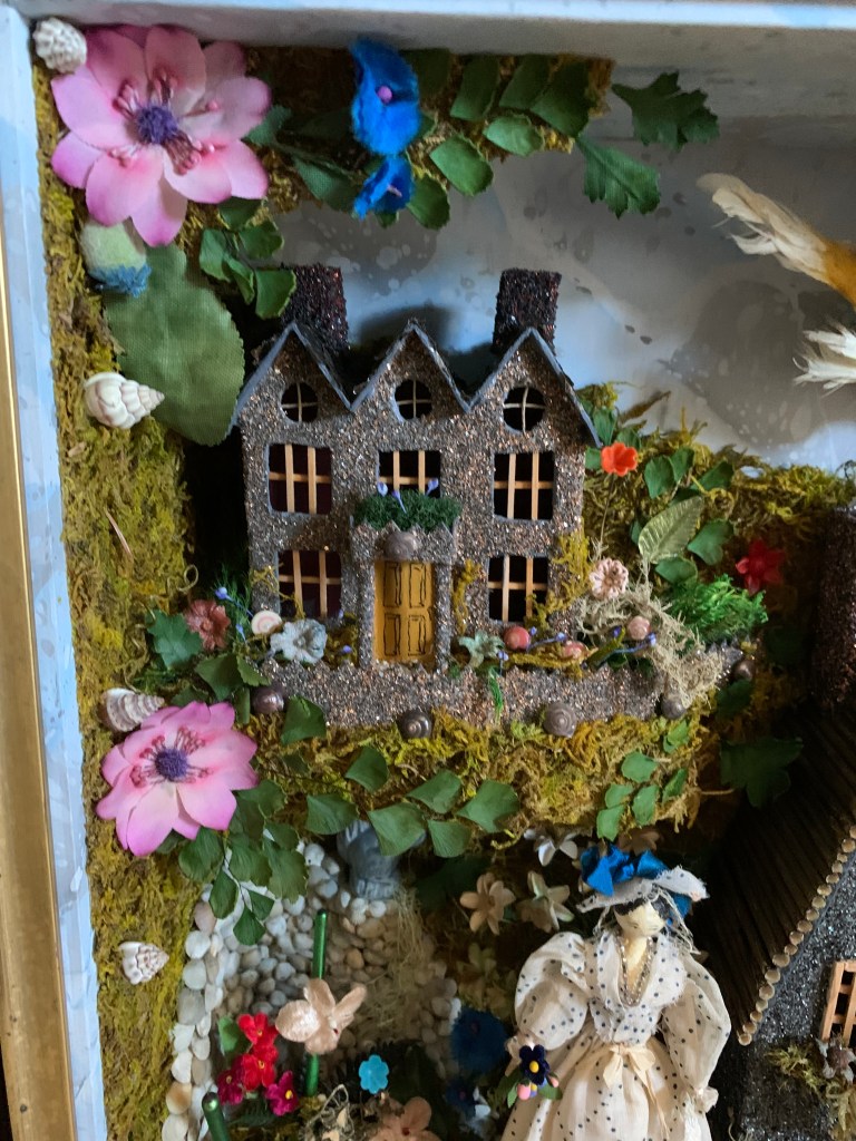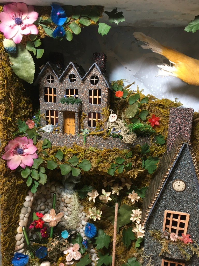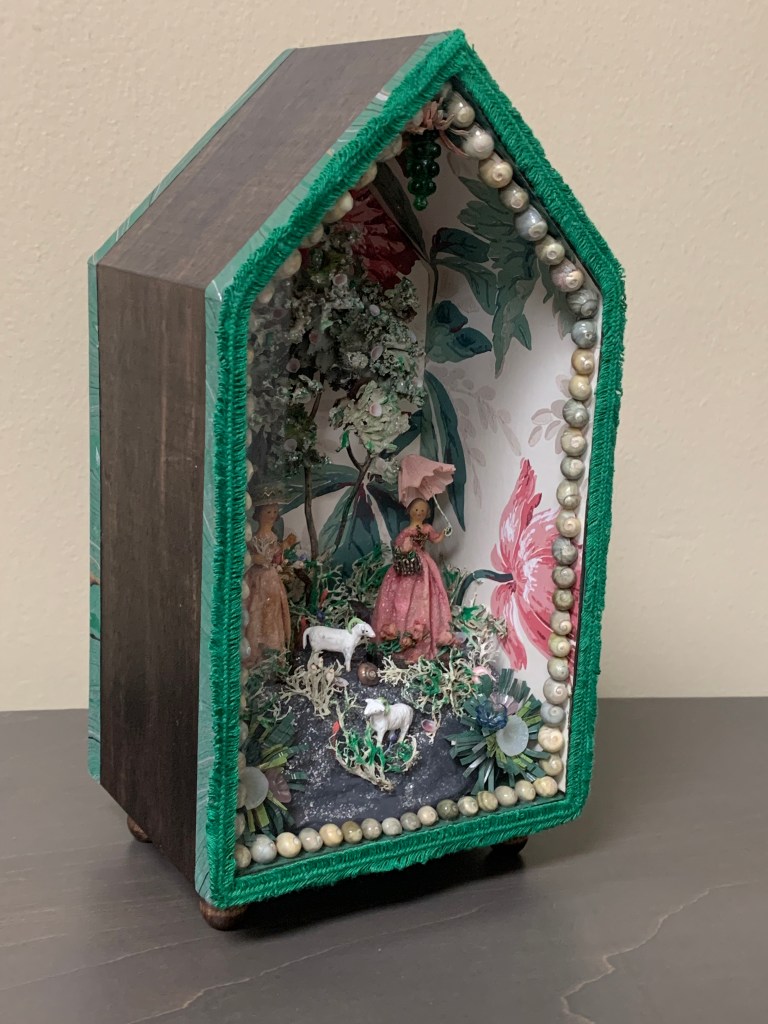 This one was lots of fun. I was outbid on an antique box with similar elements. It had a real bird that was sort of tattered and a couple of antique wooden dolls along with some houses decorated with glitter. There was lots of moss and small animals throughout. Someone gave me this nice 18 inch square antique frame, but I had to build the box portion out to make it deeper. The original had items all out of scale and I liked it a lot. My version has an antique wooden doll in a garden world that consists of two levels with structures; a mirror pond, a squirrel, and also a large (not real) out of scale bird. There are many different types of genuine and faux plants and flowers throughout the garden. Because it’s new, the colors are much brighter and more cheerful than the old version I liked, so in some ways I’m glad I was outbid.