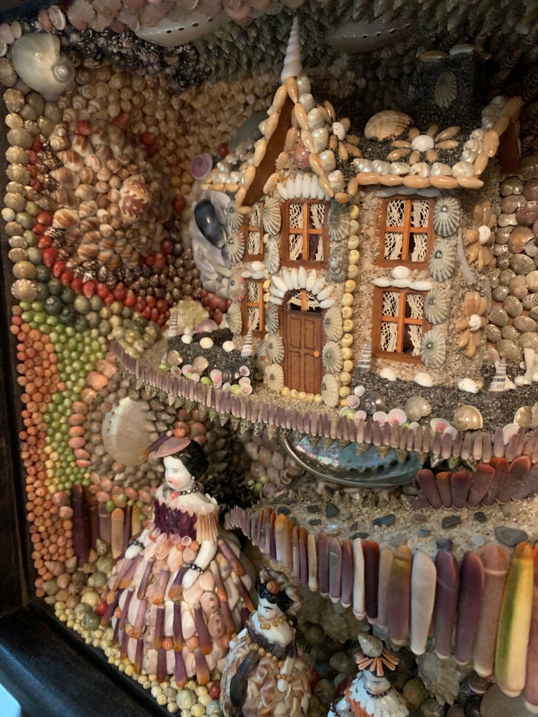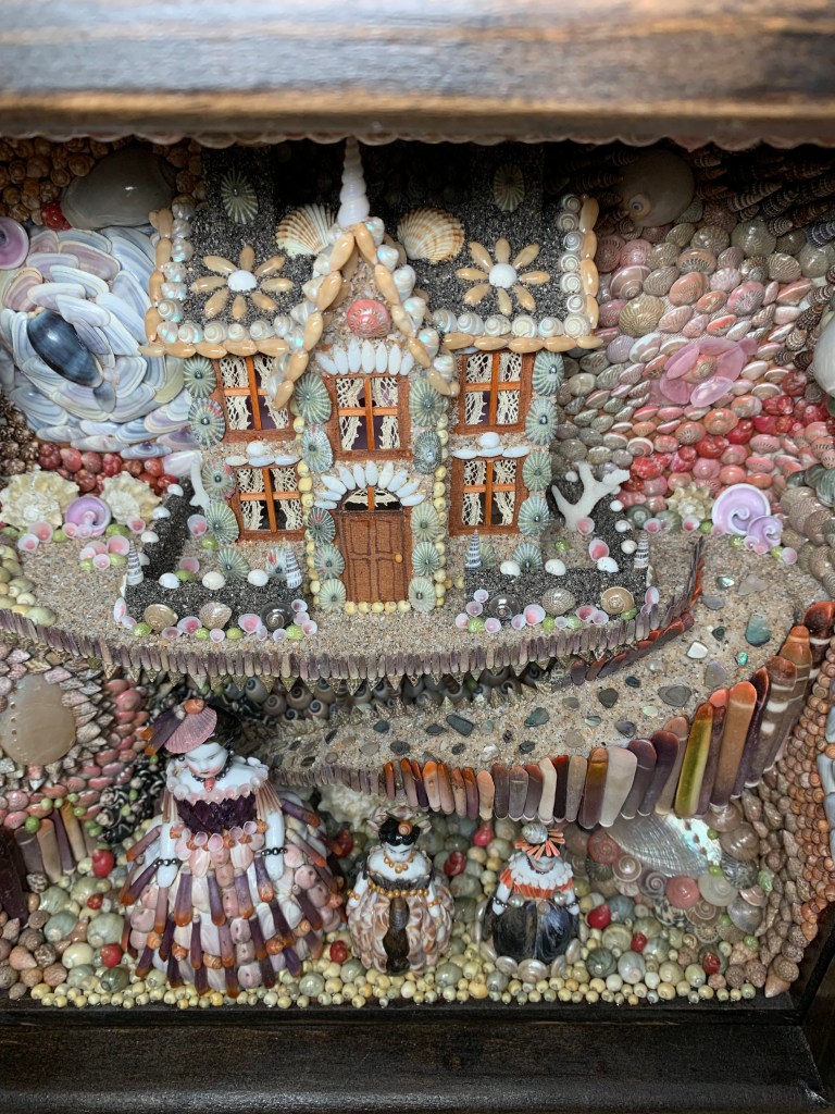 I decided I wanted to make a large and intricate shell box. I had a box made that is 16x12x6 inches. This one took over 125 hours to complete but I enjoyed the process. First I made the wooden Regency styled figures then set out to make the world they would live in. I tried to keep everything in the Regency style – the house, and garden decor including a shell covered obelisk. Most of the decor is shell related, but there is some gravel, stones, sand and moss.