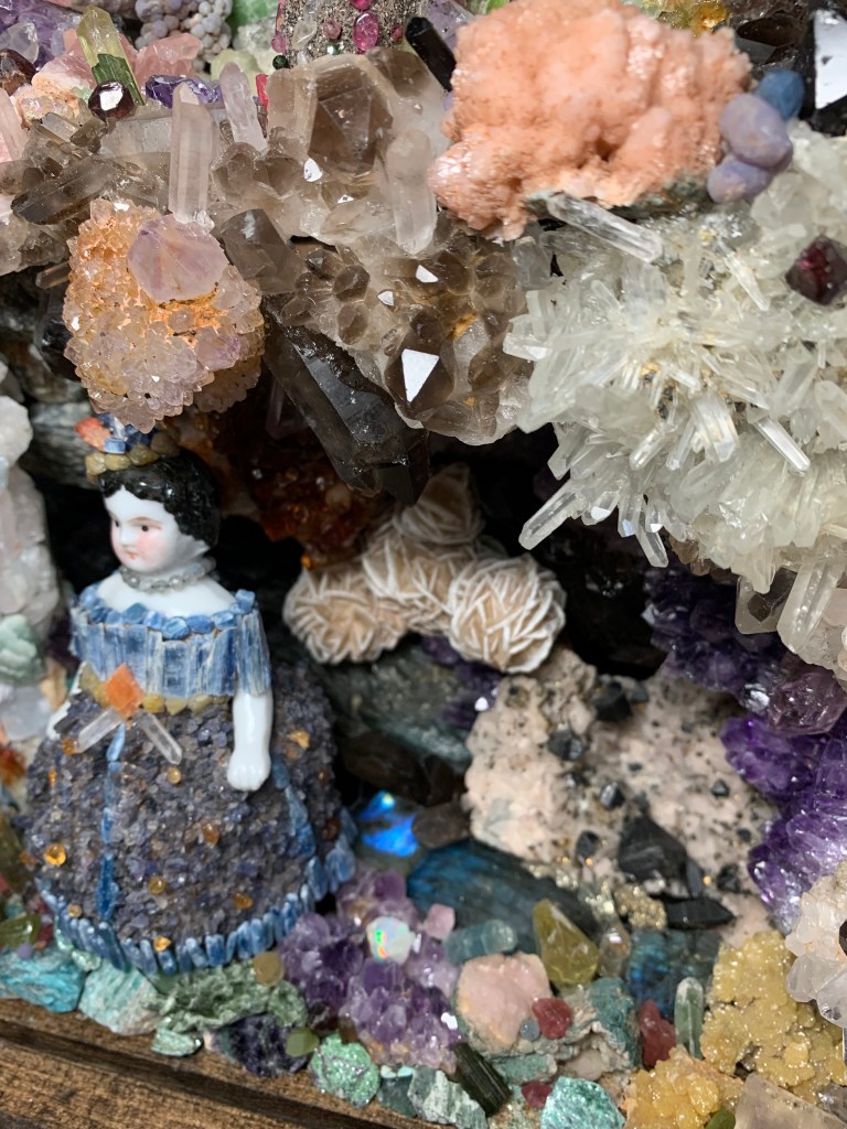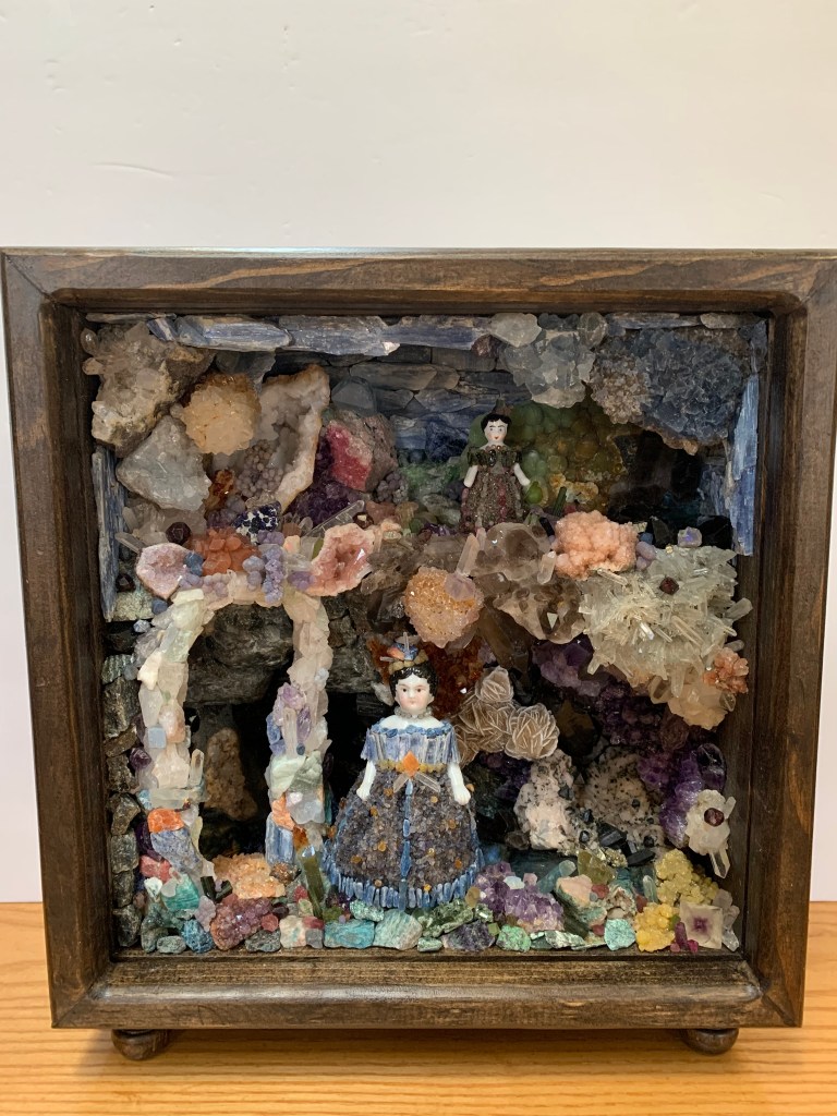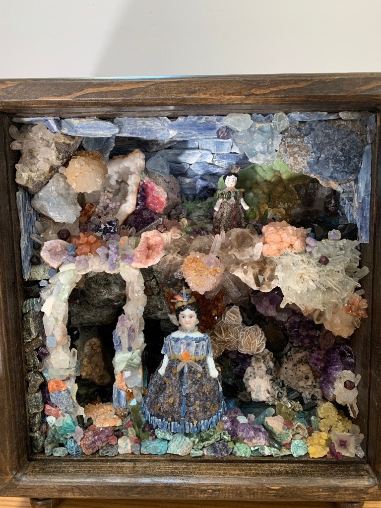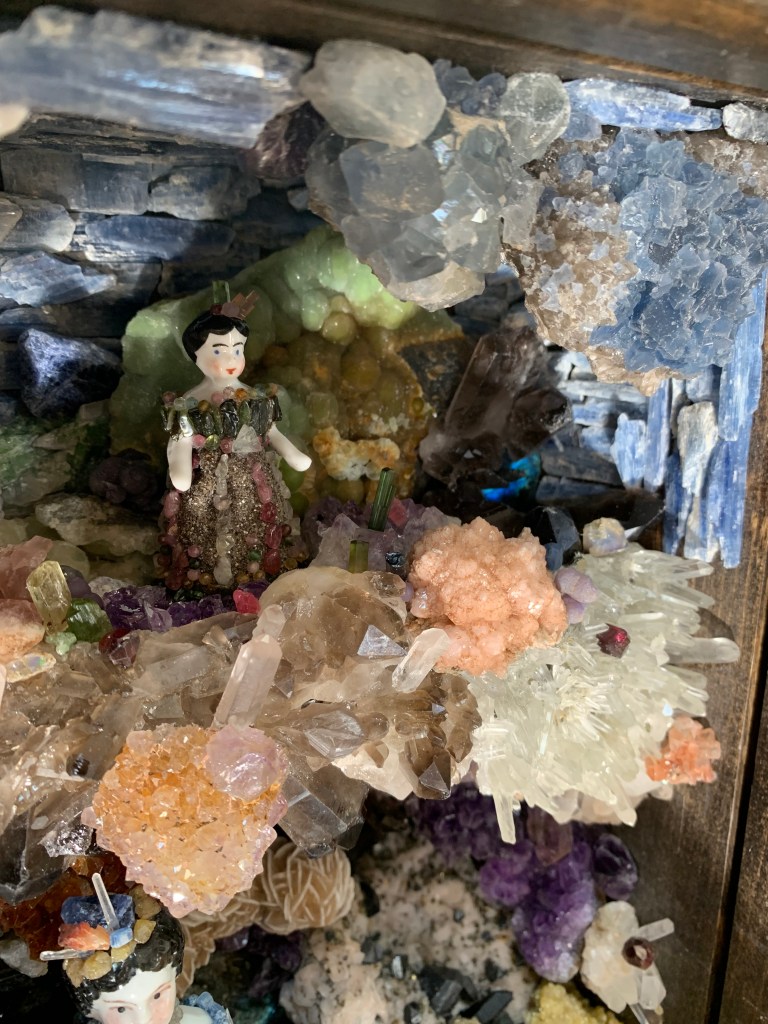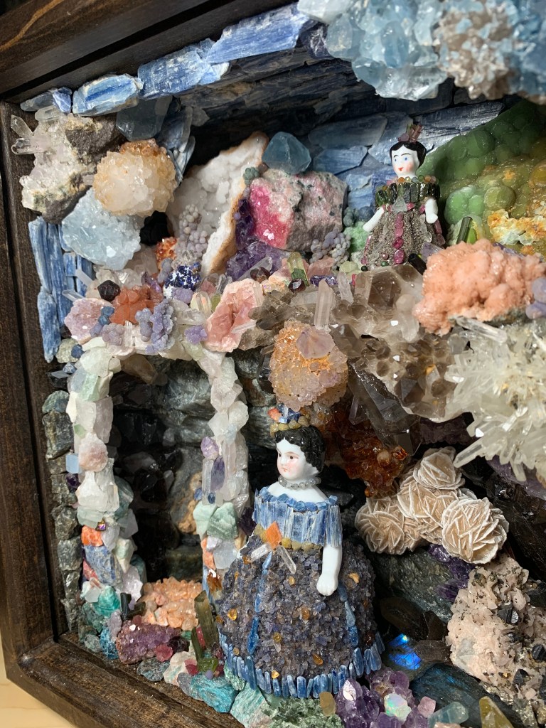 This is the companion piece to the shell shadowbox. It also incorporates antique Frozen Charlotte dolls incased in a crystal world with clothing made to correspond with their environment. There were times when I thought I bit off more than I could chew with this crystal/ mineral box. Knowing the rocks would be heavy, I used wire mesh and lightweight wood reinforcements in an attempt to keep the weight down…it didn’t work. This box is really heavy! It was fun placing the flashy stones like Labradorite and opal where they will catch light. I’ve had many of these minerals since the 80s. They’ve been packed away, and then I got this idea to use them. The interior measurements are 10x10x4 inches.