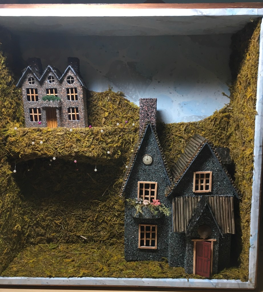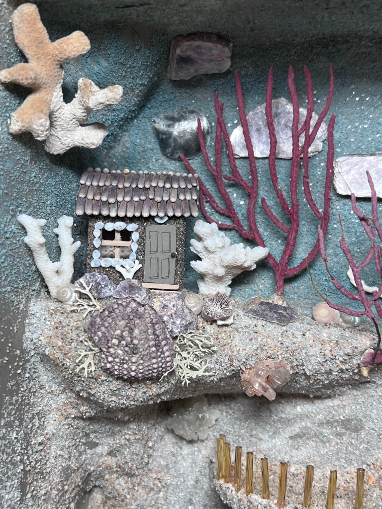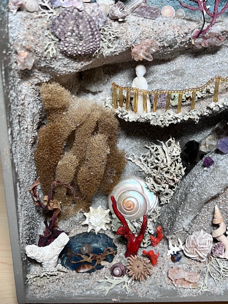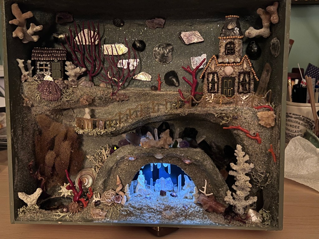 The next box, housed in a Victorian box frame is loosely inspired by the Painshill grotto in England. Painshill is an 18th century man-made crystal grotto with strategically placed cut outs to let the light in. This is the first box that has a light source added. In person, the light isn’t as blue as it appears in the pictures. It includes a sandy, shell themed world with a glass covered pond and a crystal filled grotto. There are two small houses and lots of shell, coral, moss, seaweed and mineral accents along with a fence made of glass beads. The total size is 13.5 x 15.5 inches. I really had a fun time creating this one…sometimes it was like a moonscape and sometimes like an underwater world.